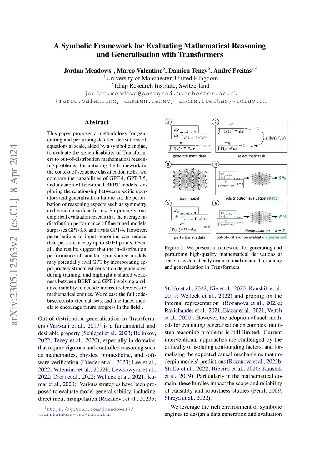 This paper proposes a methodology for generating and perturbing detailed derivations of equations at scale, aided by a symbolic engine, to evaluate the generalisability of Transformers to out-of-distribution mathematical reasoning problems. Instantiating the framework in the context of sequence classification tasks, we compare the capabilities of GPT-4, GPT-3.5, and a canon of fine-tuned BERT models, exploring the relationship between specific operators and generalisation failure via the perturbation of reasoning aspects such as symmetry and variable surface forms. Surprisingly, our empirical evaluation reveals that the average in-distribution performance of fine-tuned models surpasses GPT-3.5, and rivals GPT-4. However, perturbations to input reasoning can reduce their performance by up to 80 F1 points. Overall, the results suggest that the in-distribution performance of smaller open-source models may potentially rival GPT by incorporating appropriately structured derivation dependencies during training, and highlight a shared weakness between BERT and GPT involving a relative inability to decode indirect references to mathematical entities. We release the full codebase, constructed datasets, and fine-tuned models to encourage future progress in the field.
