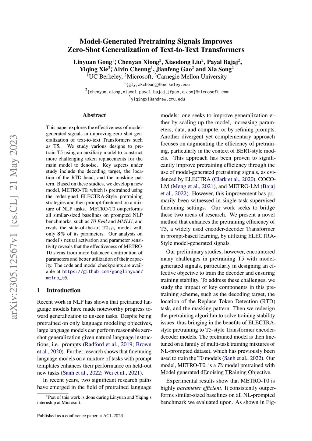 This paper explores the effectiveness of model-generated signals in improving zero-shot generalization of text-to-text Transformers such as T5. We study various designs to pretrain T5 using an auxiliary model to construct more challenging token replacements for the main model to denoise. Key aspects under study include the decoding target, the location of the RTD head, and the masking pattern. Based on these studies, we develop a new model, METRO-T0, which is pretrained using the redesigned ELECTRA-Style pretraining strategies and then prompt-finetuned on a mixture of NLP tasks. METRO-T0 outperforms all similar-sized baselines on prompted NLP benchmarks, such as T0 Eval and MMLU, and rivals the state-of-the-art T0-11B model with only 8% of its parameters. Our analysis on model's neural activation and parameter sensitivity reveals that the effectiveness of METRO-T0 stems from more balanced contribution of parameters and better utilization of their capacity. The code and model checkpoints are available at https://github.com/gonglinyuan/metro_t0.