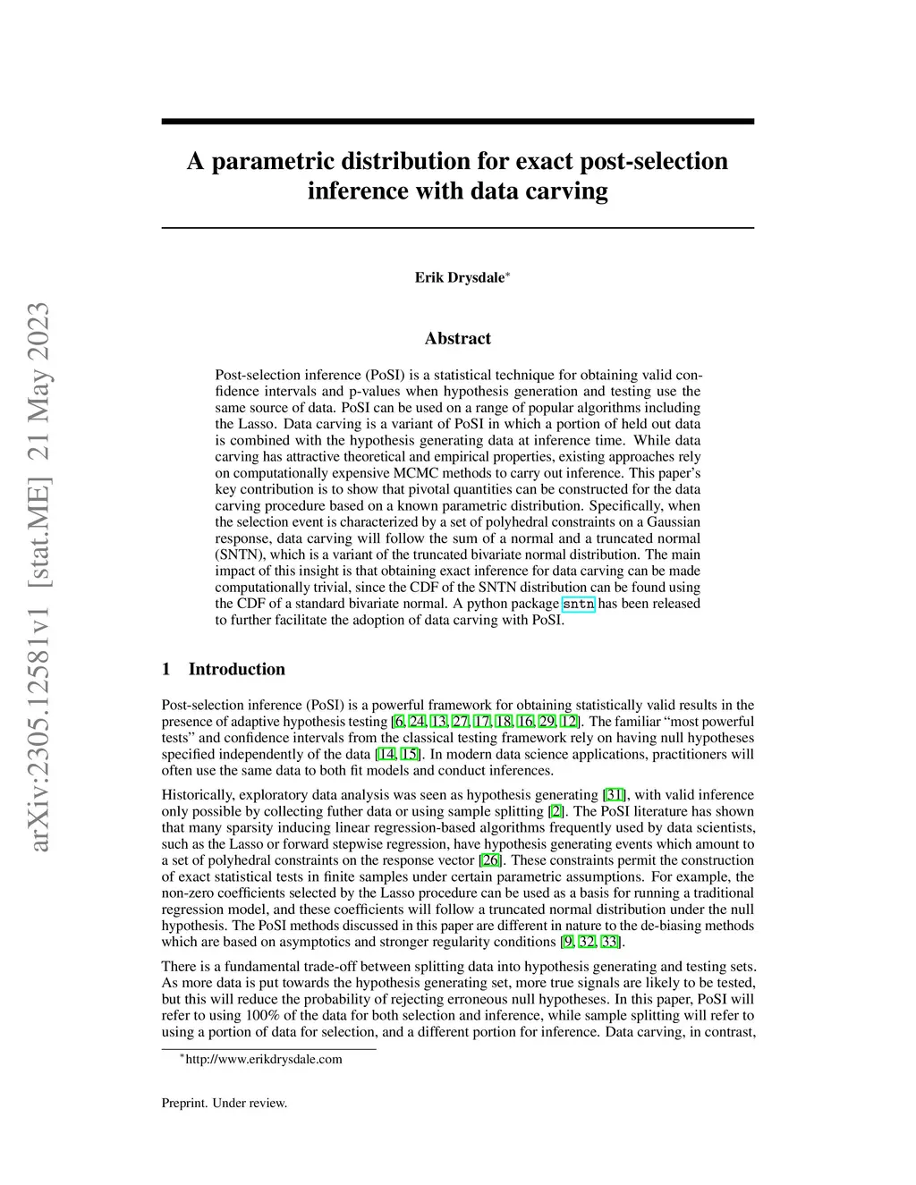Post-selection inference (PoSI) is a statistical technique for obtaining valid confidence intervals and p-values when hypothesis generation and testing use the same source of data. PoSI can be used on a range of popular algorithms including the Lasso. Data carving is a variant of PoSI in which a portion of held out data is combined with the hypothesis generating data at inference time. While data carving has attractive theoretical and empirical properties, existing approaches rely on computationally expensive MCMC methods to carry out inference. This paper's key contribution is to show that pivotal quantities can be constructed for the data carving procedure based on a known parametric distribution. Specifically, when the selection event is characterized by a set of polyhedral constraints on a Gaussian response, data carving will follow the sum of a normal and a truncated normal (SNTN), which is a variant of the truncated bivariate normal distribution. The main impact of this insight is that obtaining exact inference for data carving can be made computationally trivial, since the CDF of the SNTN distribution can be found using the CDF of a standard bivariate normal. A python package sntn has been released to further facilitate the adoption of data carving with PoSI.