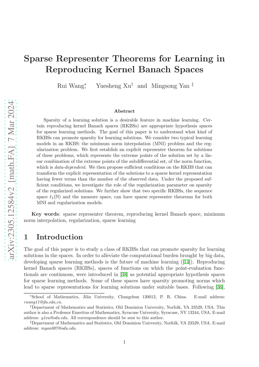Sparsity of a learning solution is a desirable feature in machine learning. Certain reproducing kernel Banach spaces (RKBSs) are appropriate hypothesis spaces for sparse learning methods. The goal of this paper is to understand what kind of RKBSs can promote sparsity for learning solutions. We consider two typical learning models in an RKBS: the minimum norm interpolation (MNI) problem and the regularization problem. We first establish an explicit representer theorem for solutions of these problems, which represents the extreme points of the solution set by a linear combination of the extreme points of the subdifferential set, of the norm function, which is data-dependent. We then propose sufficient conditions on the RKBS that can transform the explicit representation of the solutions to a sparse kernel representation having fewer terms than the number of the observed data. Under the proposed sufficient conditions, we investigate the role of the regularization parameter on sparsity of the regularized solutions. We further show that two specific RKBSs: the sequence space and the measure space can have sparse representer theorems for both MNI and regularization models.