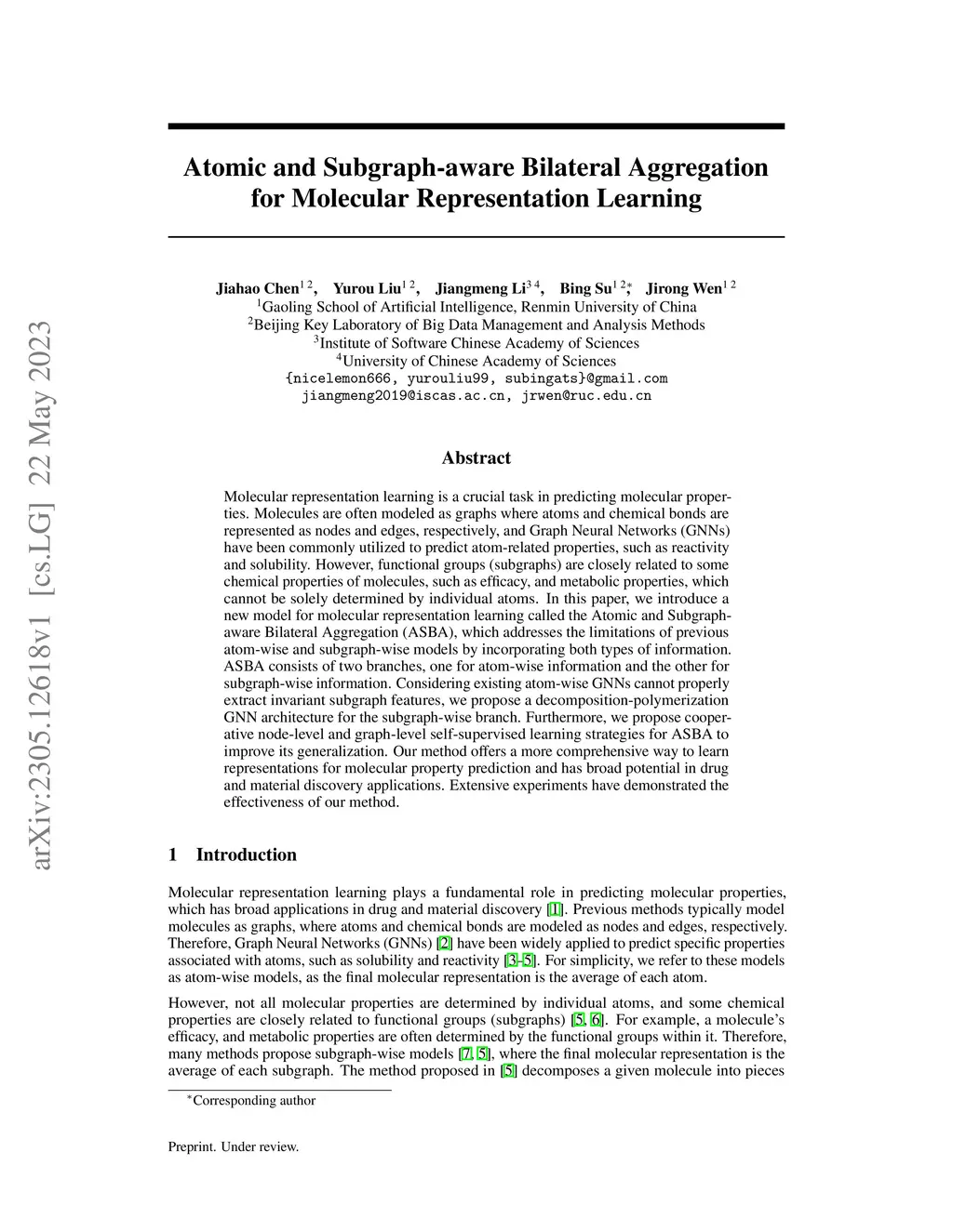 Molecular representation learning is a crucial task in predicting molecular properties. Molecules are often modeled as graphs where atoms and chemical bonds are represented as nodes and edges, respectively, and Graph Neural Networks (GNNs) have been commonly utilized to predict atom-related properties, such as reactivity and solubility. However, functional groups (subgraphs) are closely related to some chemical properties of molecules, such as efficacy, and metabolic properties, which cannot be solely determined by individual atoms. In this paper, we introduce a new model for molecular representation learning called the Atomic and Subgraph-aware Bilateral Aggregation (ASBA), which addresses the limitations of previous atom-wise and subgraph-wise models by incorporating both types of information. ASBA consists of two branches, one for atom-wise information and the other for subgraph-wise information. Considering existing atom-wise GNNs cannot properly extract invariant subgraph features, we propose a decomposition-polymerization GNN architecture for the subgraph-wise branch. Furthermore, we propose cooperative node-level and graph-level self-supervised learning strategies for ASBA to improve its generalization. Our method offers a more comprehensive way to learn representations for molecular property prediction and has broad potential in drug and material discovery applications. Extensive experiments have demonstrated the effectiveness of our method.