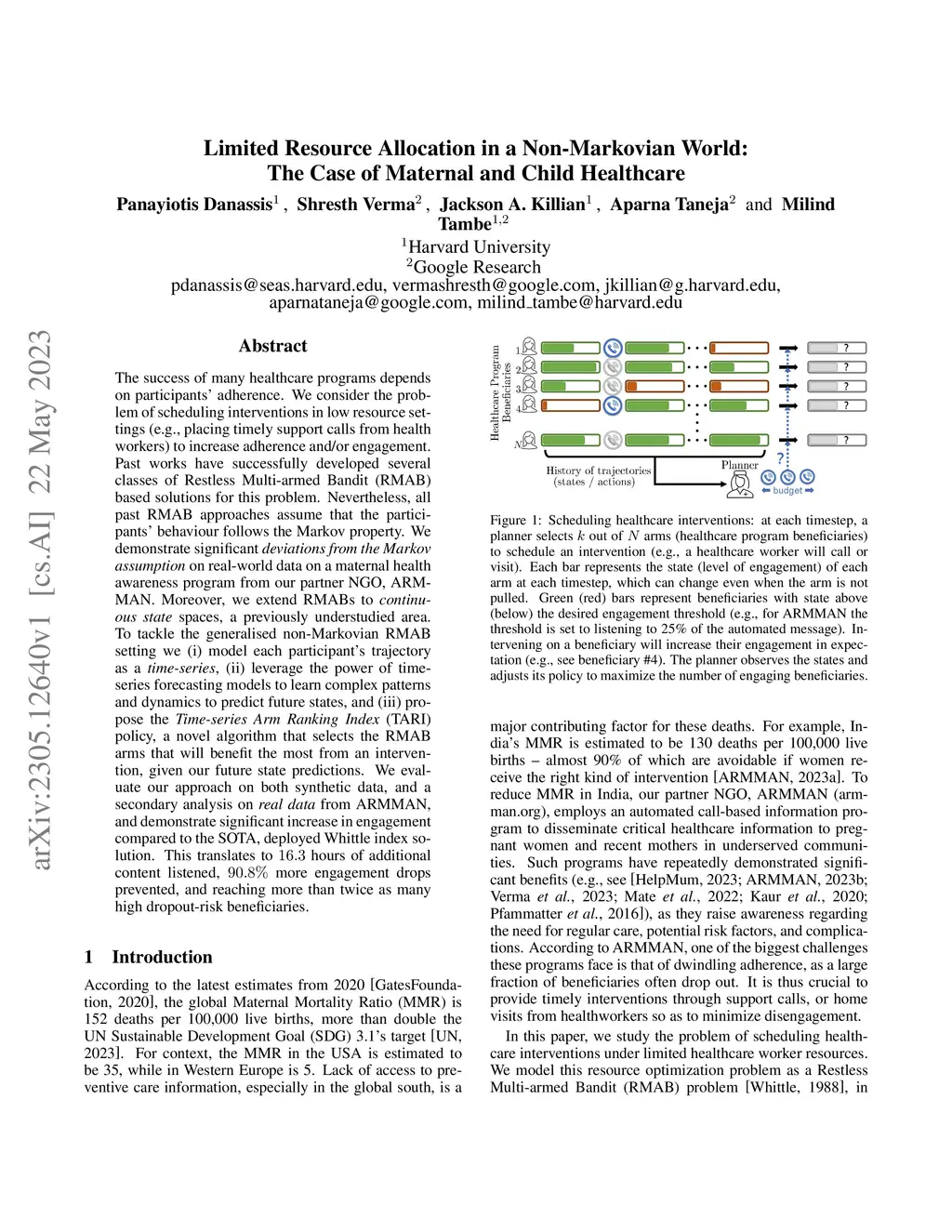 The success of many healthcare programs depends on participants' adherence. We consider the problem of scheduling interventions in low resource settings (e.g., placing timely support calls from health workers) to increase adherence and/or engagement. Past works have successfully developed several classes of Restless Multi-armed Bandit (RMAB) based solutions for this problem. Nevertheless, all past RMAB approaches assume that the participants' behaviour follows the Markov property. We demonstrate significant deviations from the Markov assumption on real-world data on a maternal health awareness program from our partner NGO, ARMMAN. Moreover, we extend RMABs to continuous state spaces, a previously understudied area. To tackle the generalised non-Markovian RMAB setting we (i) model each participant's trajectory as a time-series, (ii) leverage the power of time-series forecasting models to learn complex patterns and dynamics to predict future states, and (iii) propose the Time-series Arm Ranking Index (TARI) policy, a novel algorithm that selects the RMAB arms that will benefit the most from an intervention, given our future state predictions. We evaluate our approach on both synthetic data, and a secondary analysis on real data from ARMMAN, and demonstrate significant increase in engagement compared to the SOTA, deployed Whittle index solution. This translates to 16.3 hours of additional content listened, 90.8% more engagement drops prevented, and reaching more than twice as many high dropout-risk beneficiaries.