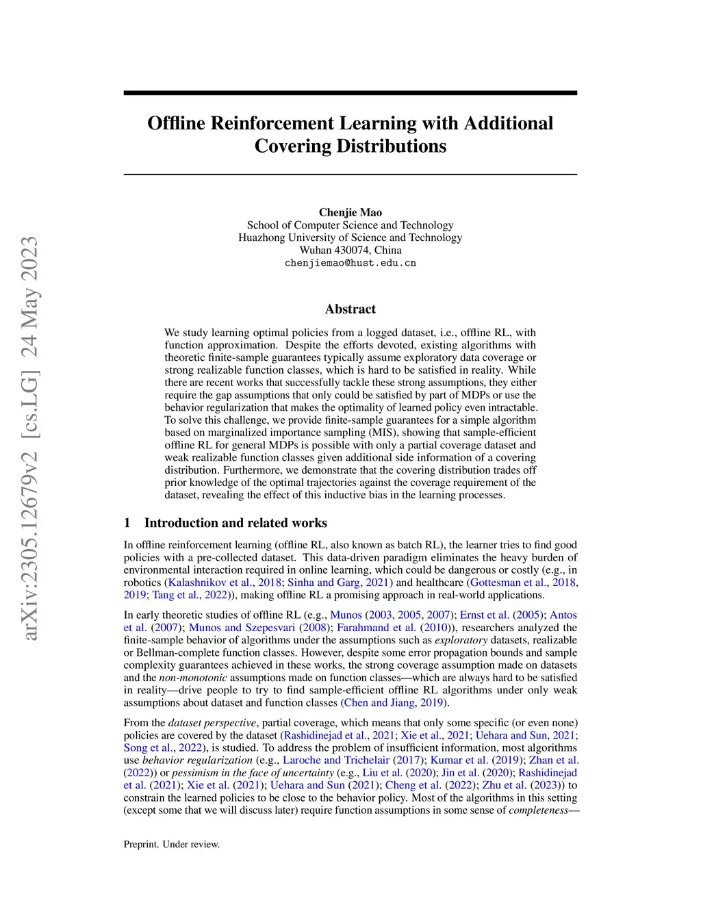 We study learning optimal policies from a logged dataset, i.e., offline RL, with function approximation. Despite the efforts devoted, existing algorithms with theoretic finite-sample guarantees typically assume exploratory data coverage or strong realizable function classes, which is hard to be satisfied in reality. While there are recent works that successfully tackle these strong assumptions, they either require the gap assumptions that only could be satisfied by part of MDPs or use the behavior regularization that makes the optimality of learned policy even intractable. To solve this challenge, we provide finite-sample guarantees for a simple algorithm based on marginalized importance sampling (MIS), showing that sample-efficient offline RL for general MDPs is possible with only a partial coverage dataset and weak realizable function classes given additional side information of a covering distribution. Furthermore, we demonstrate that the covering distribution trades off prior knowledge of the optimal trajectories against the coverage requirement of the dataset, revealing the effect of this inductive bias in the learning processes.