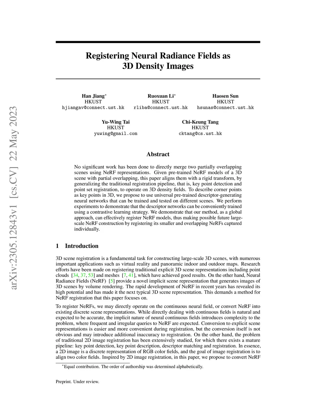 No significant work has been done to directly merge two partially overlapping scenes using NeRF representations. Given pre-trained NeRF models of a 3D scene with partial overlapping, this paper aligns them with a rigid transform, by generalizing the traditional registration pipeline, that is, key point detection and point set registration, to operate on 3D density fields. To describe corner points as key points in 3D, we propose to use universal pre-trained descriptor-generating neural networks that can be trained and tested on different scenes. We perform experiments to demonstrate that the descriptor networks can be conveniently trained using a contrastive learning strategy. We demonstrate that our method, as a global approach, can effectively register NeRF models, thus making possible future large-scale NeRF construction by registering its smaller and overlapping NeRFs captured individually.