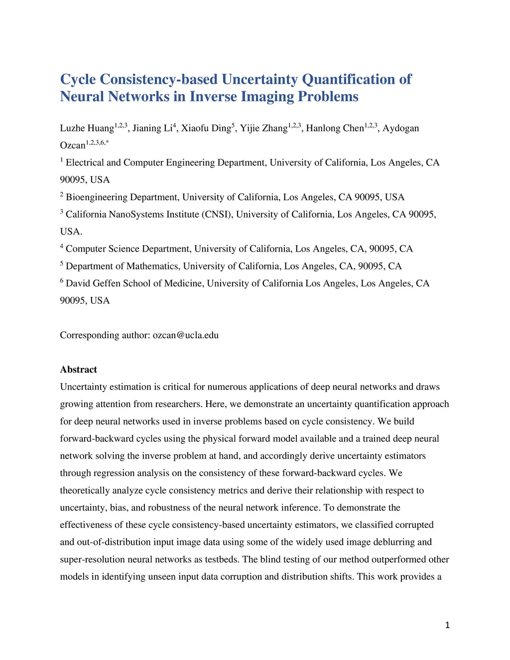 Uncertainty estimation is critical for numerous applications of deep neural networks and draws growing attention from researchers. Here, we demonstrate an uncertainty quantification approach for deep neural networks used in inverse problems based on cycle consistency. We build forward-backward cycles using the physical forward model available and a trained deep neural network solving the inverse problem at hand, and accordingly derive uncertainty estimators through regression analysis on the consistency of these forward-backward cycles. We theoretically analyze cycle consistency metrics and derive their relationship with respect to uncertainty, bias, and robustness of the neural network inference. To demonstrate the effectiveness of these cycle consistency-based uncertainty estimators, we classified corrupted and out-of-distribution input image data using some of the widely used image deblurring and super-resolution neural networks as testbeds. The blind testing of our method outperformed other models in identifying unseen input data corruption and distribution shifts. This work provides a simple-to-implement and rapid uncertainty quantification method that can be universally applied to various neural networks used for solving inverse problems.
