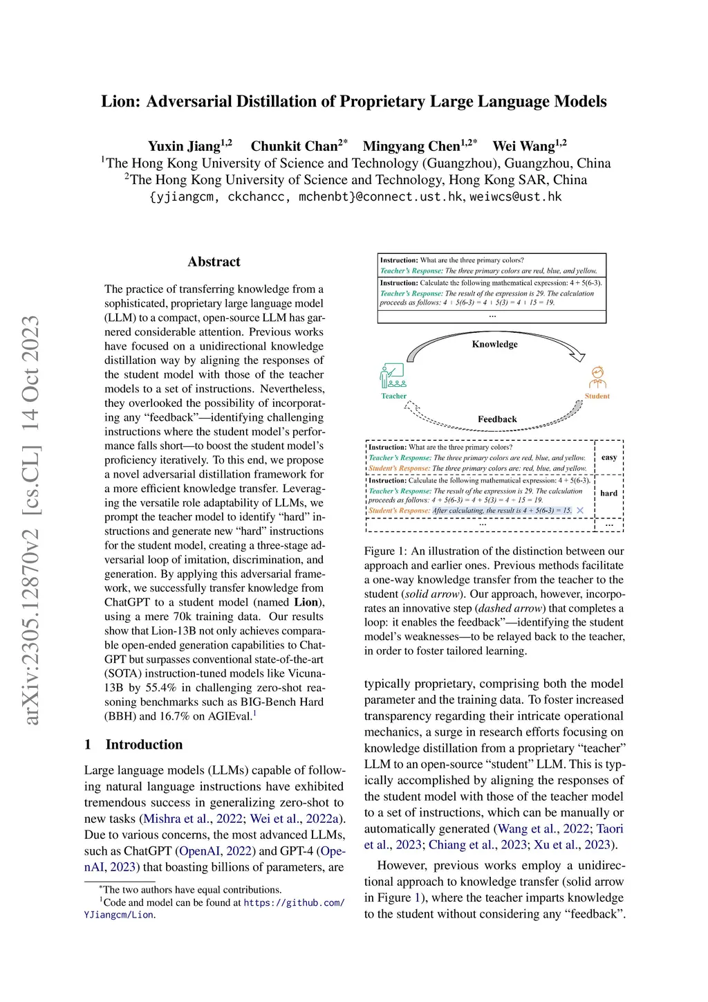 The practice of transferring knowledge from a sophisticated, proprietary large language model (LLM) to a compact, open-source LLM has garnered considerable attention. Previous works have focused on a unidirectional knowledge distillation way by aligning the responses of the student model with those of the teacher model to a set of instructions. Nevertheless, they overlooked the possibility of incorporating any reciprocal "feedback"--identifying challenging instructions where the student model's performance falls short--to boost the student model's proficiency iteratively. To this end, we propose a novel adversarial distillation framework for a more efficient knowledge transfer. Leveraging the versatile role adaptability of LLMs, we prompt the teacher model to identify "hard" instructions and generate new "hard" instructions for the student model, creating a three-stage adversarial loop of imitation, discrimination, and generation. By applying this adversarial framework, we successfully transfer knowledge from ChatGPT to a student model (named Lion), using a mere 70k training data. Our results show that Lion-13B not only achieves comparable open-ended generation capabilities to ChatGPT but surpasses conventional state-of-the-art (SOTA) instruction-tuned models like Vicuna-13B by 55.4% in challenging zero-shot reasoning benchmarks such as BIG-Bench Hard (BBH) and 16.7% on AGIEval. Code and model can be found at https://github.com/YJiangcm/Lion.