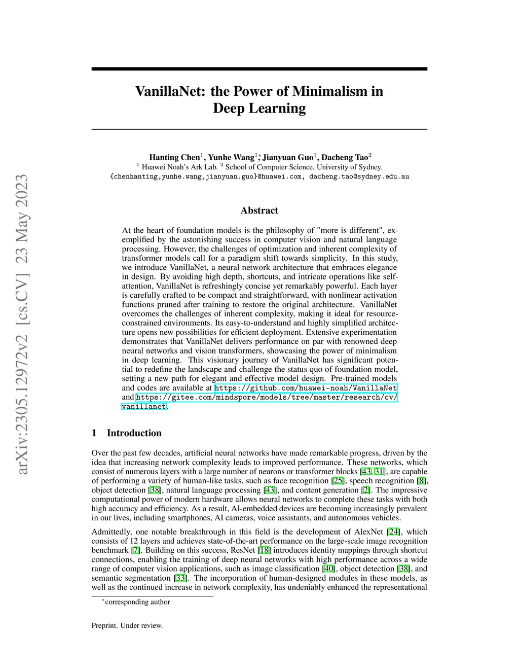 At the heart of foundation models is the philosophy of "more is different", exemplified by the astonishing success in computer vision and natural language processing. However, the challenges of optimization and inherent complexity of transformer models call for a paradigm shift towards simplicity. In this study, we introduce VanillaNet, a neural network architecture that embraces elegance in design. By avoiding high depth, shortcuts, and intricate operations like self-attention, VanillaNet is refreshingly concise yet remarkably powerful. Each layer is carefully crafted to be compact and straightforward, with nonlinear activation functions pruned after training to restore the original architecture. VanillaNet overcomes the challenges of inherent complexity, making it ideal for resource-constrained environments. Its easy-to-understand and highly simplified architecture opens new possibilities for efficient deployment. Extensive experimentation demonstrates that VanillaNet delivers performance on par with renowned deep neural networks and vision transformers, showcasing the power of minimalism in deep learning. This visionary journey of VanillaNet has significant potential to redefine the landscape and challenge the status quo of foundation model, setting a new path for elegant and effective model design. Pre-trained models and codes are available at https://github.com/huawei-noah/VanillaNet and https://gitee.com/mindspore/models/tree/master/research/cv/vanillanet.