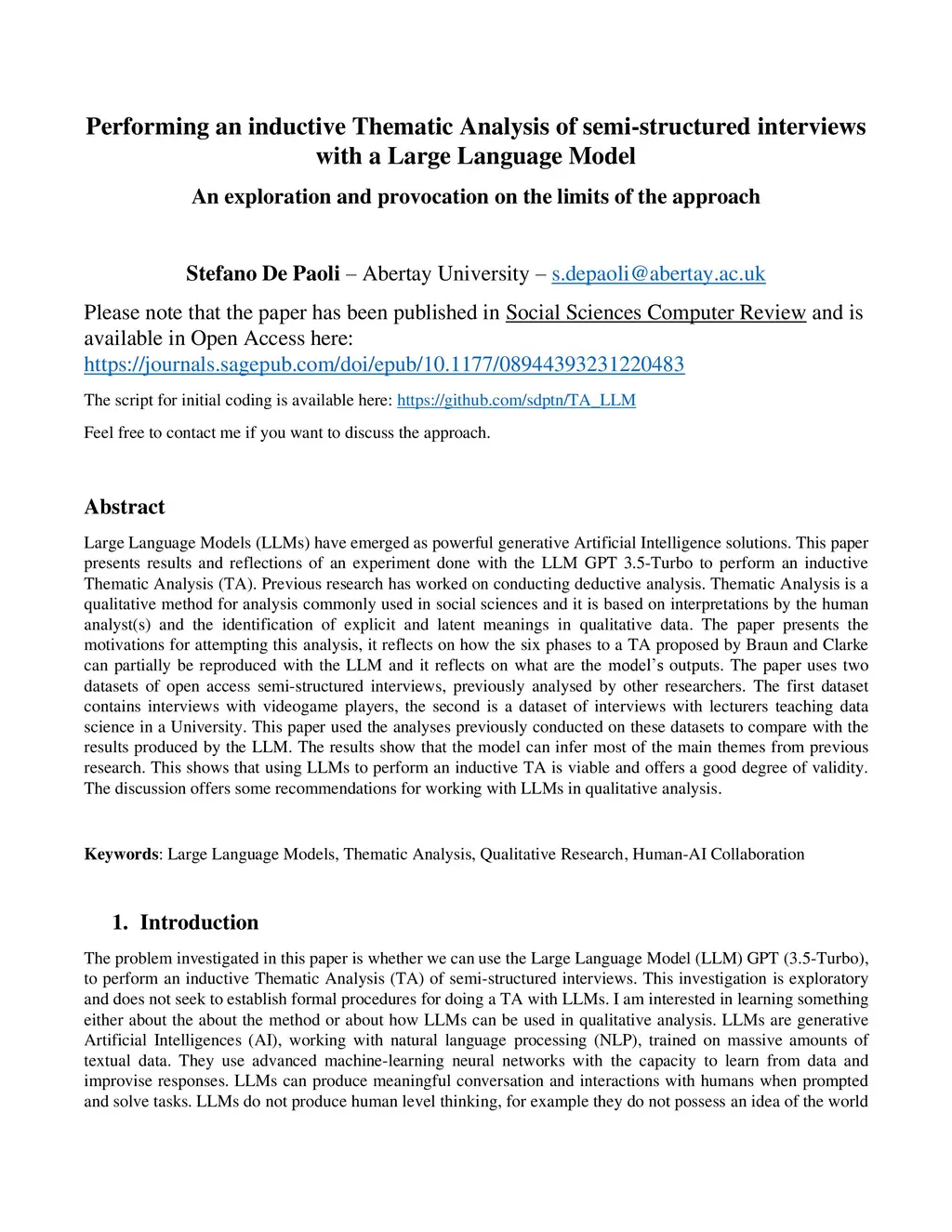 Can Large Language Models emulate an inductive Thematic Analysis of semi-structured interviews? An exploration and provocation on the limits of the approach and the model