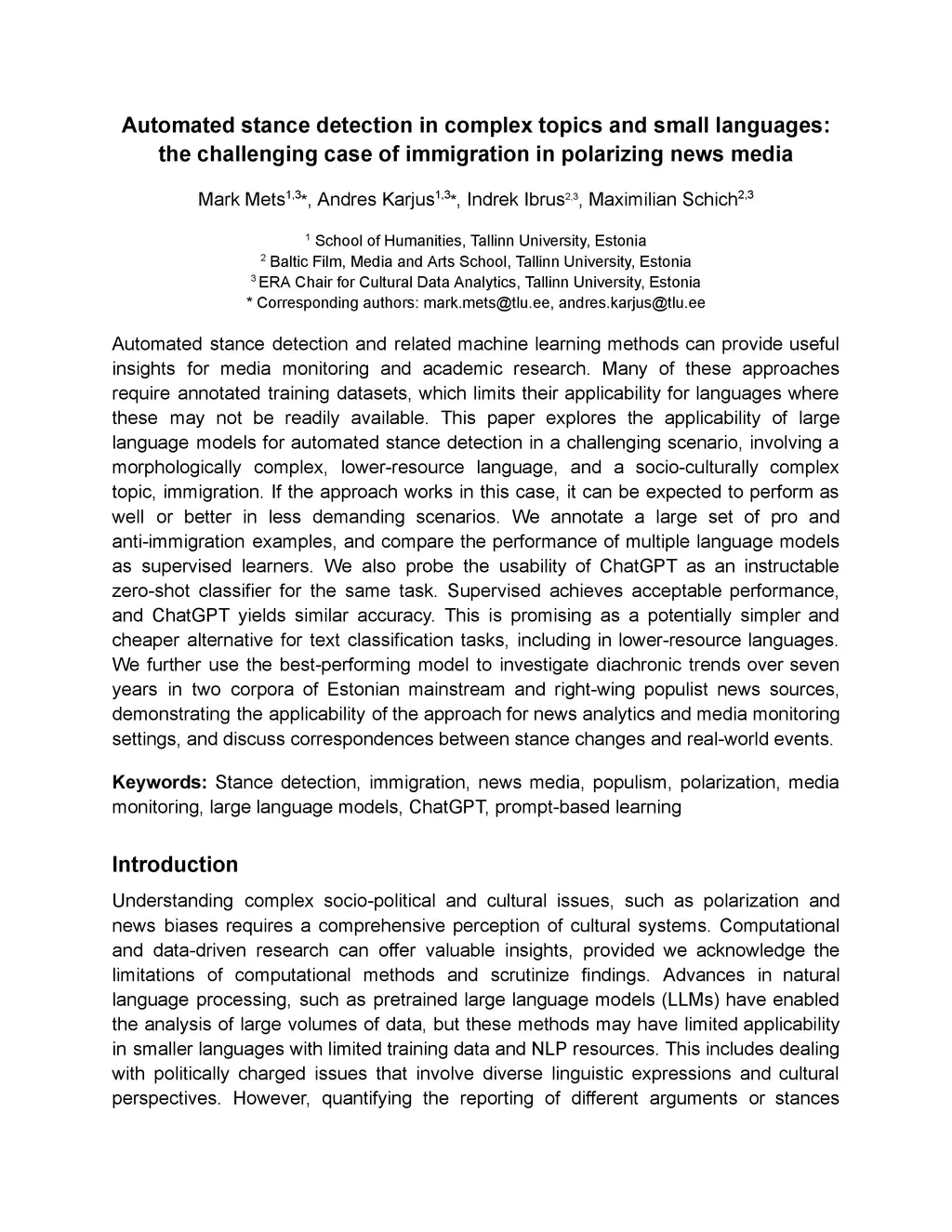 Automated stance detection and related machine learning methods can provide useful insights for media monitoring and academic research. Many of these approaches require annotated training datasets, which limits their applicability for languages where these may not be readily available. This paper explores the applicability of large language models for automated stance detection in a challenging scenario, involving a morphologically complex, lower-resource language, and a socio-culturally complex topic, immigration. If the approach works in this case, it can be expected to perform as well or better in less demanding scenarios. We annotate a large set of pro and anti-immigration examples, and compare the performance of multiple language models as supervised learners. We also probe the usability of ChatGPT as an instructable zero-shot classifier for the same task. Supervised achieves acceptable performance, and ChatGPT yields similar accuracy. This is promising as a potentially simpler and cheaper alternative for text classification tasks, including in lower-resource languages. We further use the best-performing model to investigate diachronic trends over seven years in two corpora of Estonian mainstream and right-wing populist news sources, demonstrating the applicability of the approach for news analytics and media monitoring settings, and discuss correspondences between stance changes and real-world events.