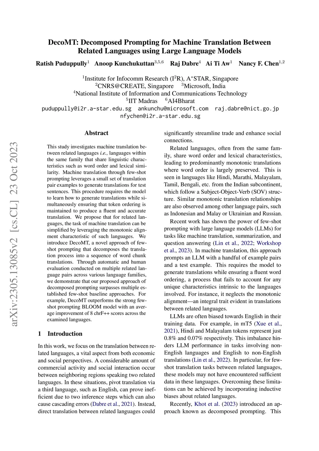 This study investigates machine translation between related languages i.e., languages within the same family that share linguistic characteristics such as word order and lexical similarity. Machine translation through few-shot prompting leverages a small set of translation pair examples to generate translations for test sentences. This procedure requires the model to learn how to generate translations while simultaneously ensuring that token ordering is maintained to produce a fluent and accurate translation. We propose that for related languages, the task of machine translation can be simplified by leveraging the monotonic alignment characteristic of such languages. We introduce DecoMT, a novel approach of few-shot prompting that decomposes the translation process into a sequence of word chunk translations. Through automatic and human evaluation conducted on multiple related language pairs across various language families, we demonstrate that our proposed approach of decomposed prompting surpasses multiple established few-shot baseline approaches. For example, DecoMT outperforms the strong few-shot prompting BLOOM model with an average improvement of 8 chrF++ scores across the examined languages.