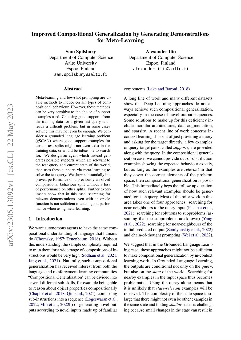 Meta-learning and few-shot prompting are viable methods to induce certain types of compositional behaviour. However, these methods can be very sensitive to the choice of support examples used. Choosing good supports from the training data for a given test query is already a difficult problem, but in some cases solving this may not even be enough. We consider a grounded language learning problem (gSCAN) where good support examples for certain test splits might not even exist in the training data, or would be infeasible to search for. We design an agent which instead generates possible supports which are relevant to the test query and current state of the world, then uses these supports via meta-learning to solve the test query. We show substantially improved performance on a previously unsolved compositional behaviour split without a loss of performance on other splits. Further experiments show that in this case, searching for relevant demonstrations even with an oracle function is not sufficient to attain good performance when using meta-learning.