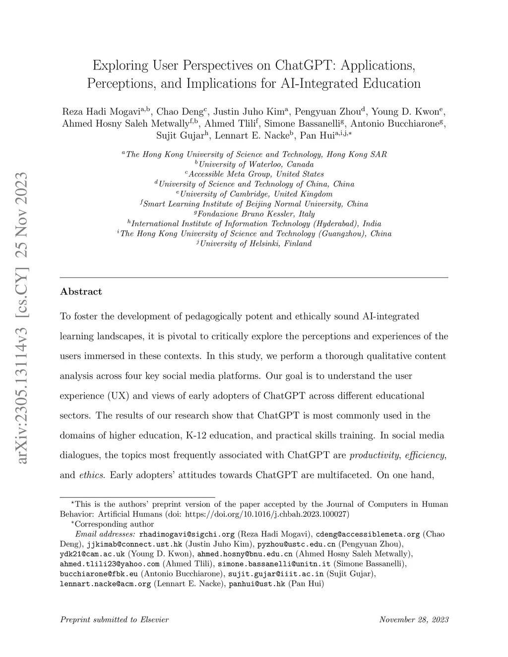 To foster the development of pedagogically potent and ethically sound AI-integrated learning landscapes, it is pivotal to critically explore the perceptions and experiences of the users immersed in these contexts. In this study, we perform a thorough qualitative content analysis across four key social media platforms. Our goal is to understand the user experience (UX) and views of early adopters of ChatGPT across different educational sectors. The results of our research show that ChatGPT is most commonly used in the domains of higher education, K-12 education, and practical skills training. In social media dialogues, the topics most frequently associated with ChatGPT are productivity, efficiency, and ethics. Early adopters' attitudes towards ChatGPT are multifaceted. On one hand, some users view it as a transformative tool capable of amplifying student self-efficacy and learning motivation. On the other hand, there is a degree of apprehension among concerned users. They worry about a potential overdependence on the AI system, which they fear might encourage superficial learning habits and erode students' social and critical thinking skills. This dichotomy of opinions underscores the complexity of Human-AI Interaction in educational contexts. Our investigation adds depth to this ongoing discourse, providing crowd-sourced insights for educators and learners who are considering incorporating ChatGPT or similar generative AI tools into their pedagogical strategies.
