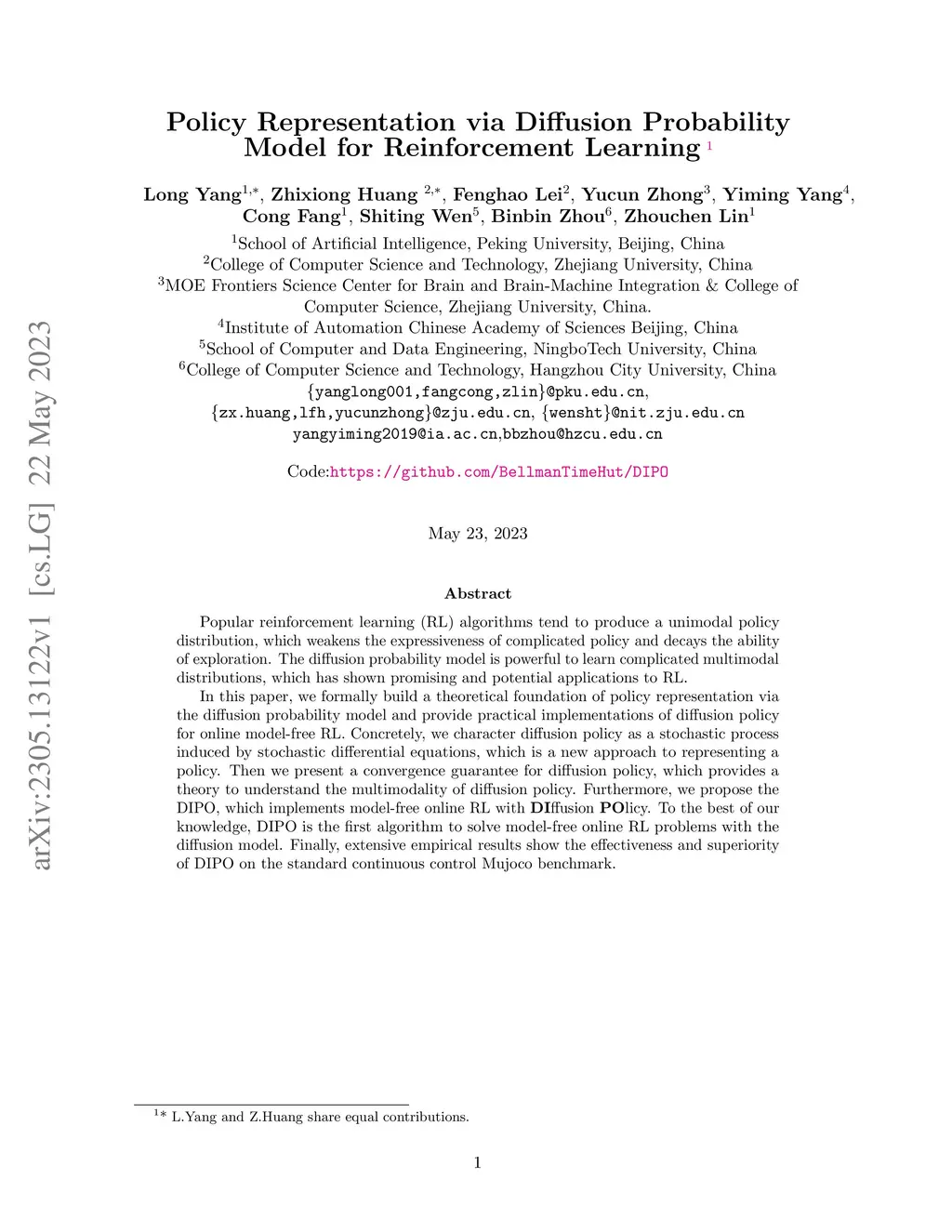 Popular reinforcement learning (RL) algorithms tend to produce a unimodal policy distribution, which weakens the expressiveness of complicated policy and decays the ability of exploration. The diffusion probability model is powerful to learn complicated multimodal distributions, which has shown promising and potential applications to RL. In this paper, we formally build a theoretical foundation of policy representation via the diffusion probability model and provide practical implementations of diffusion policy for online model-free RL. Concretely, we character diffusion policy as a stochastic process, which is a new approach to representing a policy. Then we present a convergence guarantee for diffusion policy, which provides a theory to understand the multimodality of diffusion policy. Furthermore, we propose the DIPO which is an implementation for model-free online RL with DIffusion POlicy. To the best of our knowledge, DIPO is the first algorithm to solve model-free online RL problems with the diffusion model. Finally, extensive empirical results show the effectiveness and superiority of DIPO on the standard continuous control Mujoco benchmark.