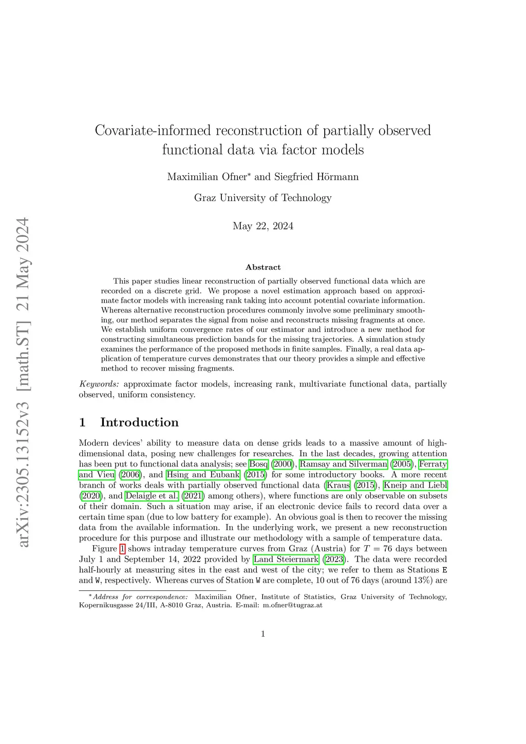 This paper studies linear reconstruction of partially observed functional data which are recorded on a discrete grid. We propose a novel estimation approach based on approximate factor models with increasing rank taking into account potential covariate information. Whereas alternative reconstruction procedures commonly involve some preliminary smoothing, our method separates the signal from noise and reconstructs missing fragments at once. We establish uniform convergence rates of our estimator and introduce a new method for constructing simultaneous prediction bands for the missing trajectories. A simulation study examines the performance of the proposed methods in finite samples. Finally, a real data application of temperature curves demonstrates that our theory provides a simple and effective method to recover missing fragments.