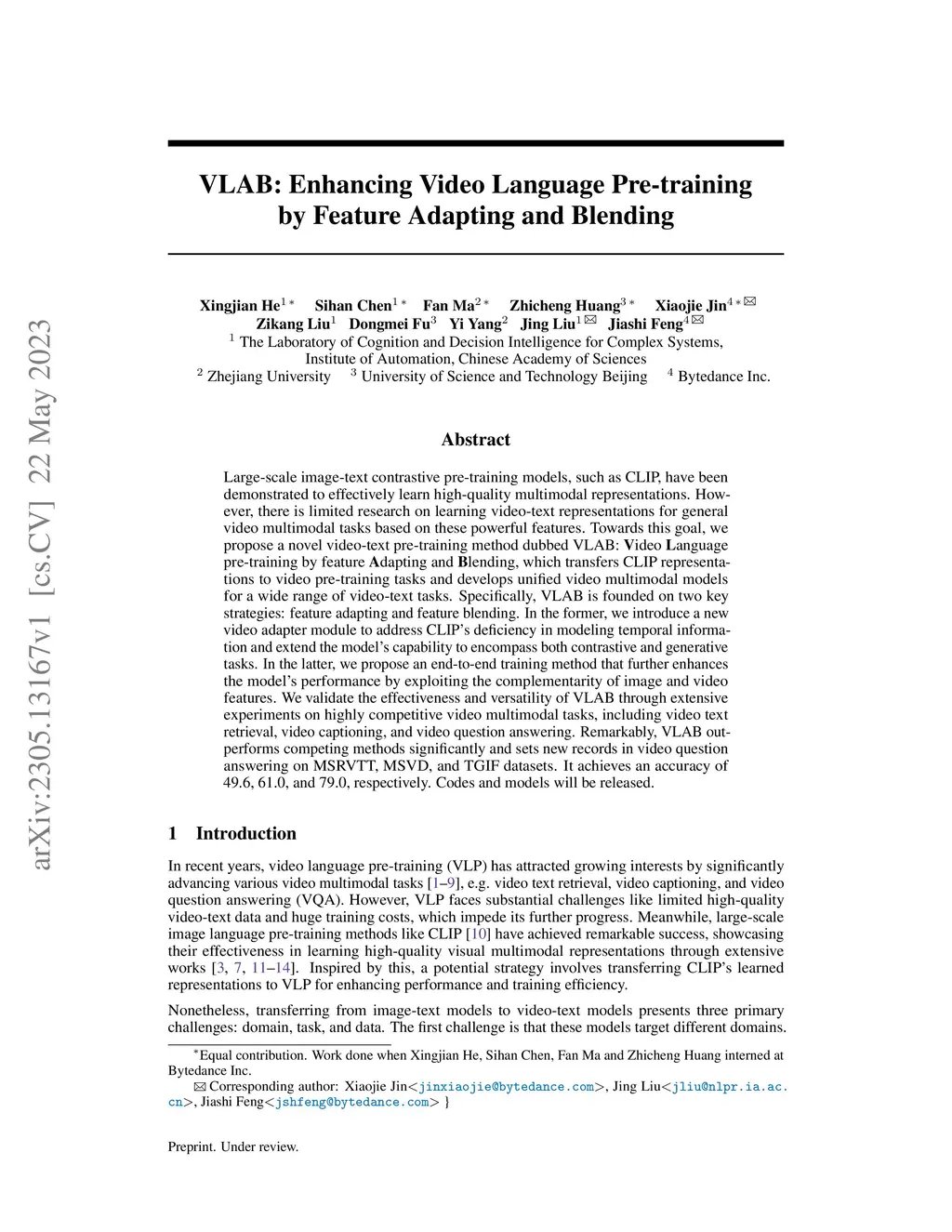 Large-scale image-text contrastive pre-training models, such as CLIP, have been demonstrated to effectively learn high-quality multimodal representations. However, there is limited research on learning video-text representations for general video multimodal tasks based on these powerful features. Towards this goal, we propose a novel video-text pre-training method dubbed VLAB: Video Language pre-training by feature Adapting and Blending, which transfers CLIP representations to video pre-training tasks and develops unified video multimodal models for a wide range of video-text tasks. Specifically, VLAB is founded on two key strategies: feature adapting and feature blending. In the former, we introduce a new video adapter module to address CLIP's deficiency in modeling temporal information and extend the model's capability to encompass both contrastive and generative tasks. In the latter, we propose an end-to-end training method that further enhances the model's performance by exploiting the complementarity of image and video features. We validate the effectiveness and versatility of VLAB through extensive experiments on highly competitive video multimodal tasks, including video text retrieval, video captioning, and video question answering. Remarkably, VLAB outperforms competing methods significantly and sets new records in video question answering on MSRVTT, MSVD, and TGIF datasets. It achieves an accuracy of 49.6, 61.0, and 79.0, respectively. Codes and models will be released.