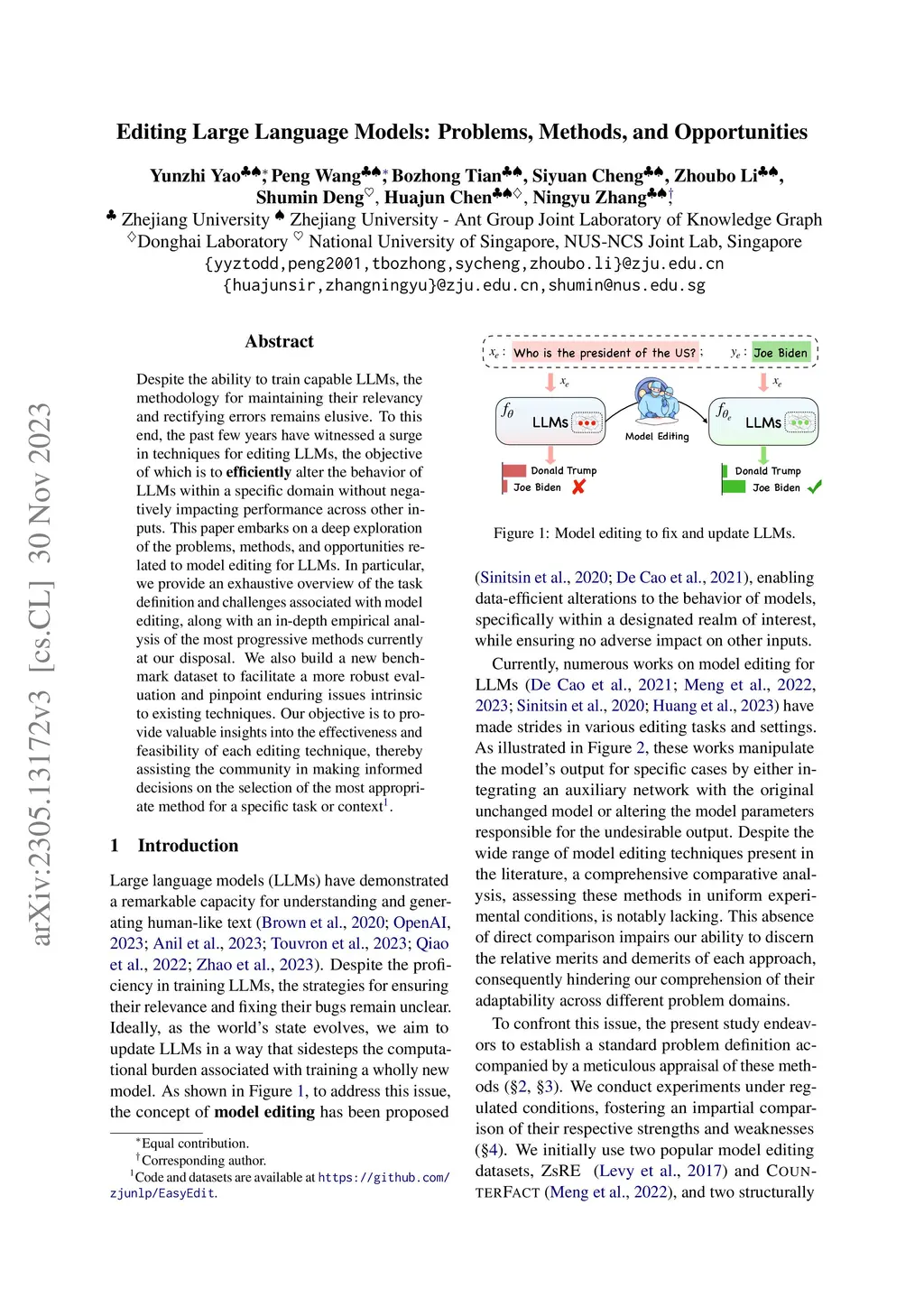 Despite the ability to train capable LLMs, the methodology for maintaining their relevancy and rectifying errors remains elusive. To this end, the past few years have witnessed a surge in techniques for editing LLMs, the objective of which is to efficiently alter the behavior of LLMs within a specific domain without negatively impacting performance across other inputs. This paper embarks on a deep exploration of the problems, methods, and opportunities related to model editing for LLMs. In particular, we provide an exhaustive overview of the task definition and challenges associated with model editing, along with an in-depth empirical analysis of the most progressive methods currently at our disposal. We also build a new benchmark dataset to facilitate a more robust evaluation and pinpoint enduring issues intrinsic to existing techniques. Our objective is to provide valuable insights into the effectiveness and feasibility of each editing technique, thereby assisting the community in making informed decisions on the selection of the most appropriate method for a specific task or context. Code and datasets are available at https://github.com/zjunlp/EasyEdit.