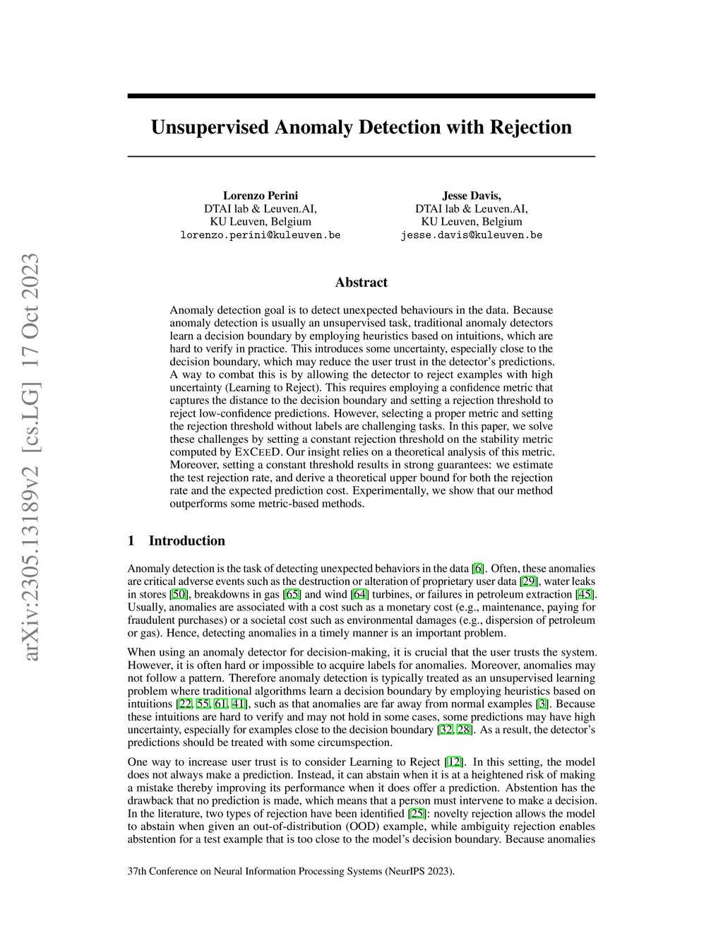 Anomaly detection aims at detecting unexpected behaviours in the data. Because anomaly detection is usually an unsupervised task, traditional anomaly detectors learn a decision boundary by employing heuristics based on intuitions, which are hard to verify in practice. This introduces some uncertainty, especially close to the decision boundary, that may reduce the user trust in the detector's predictions. A way to combat this is by allowing the detector to reject examples with high uncertainty (Learning to Reject). This requires employing a confidence metric that captures the distance to the decision boundary and setting a rejection threshold to reject low-confidence predictions. However, selecting a proper metric and setting the rejection threshold without labels are challenging tasks. In this paper, we solve these challenges by setting a constant rejection threshold on the stability metric computed by ExCeeD. Our insight relies on a theoretical analysis of such a metric. Moreover, setting a constant threshold results in strong guarantees: we estimate the test rejection rate, and derive a theoretical upper bound for both the rejection rate and the expected prediction cost. Experimentally, we show that our method outperforms some metric-based methods.