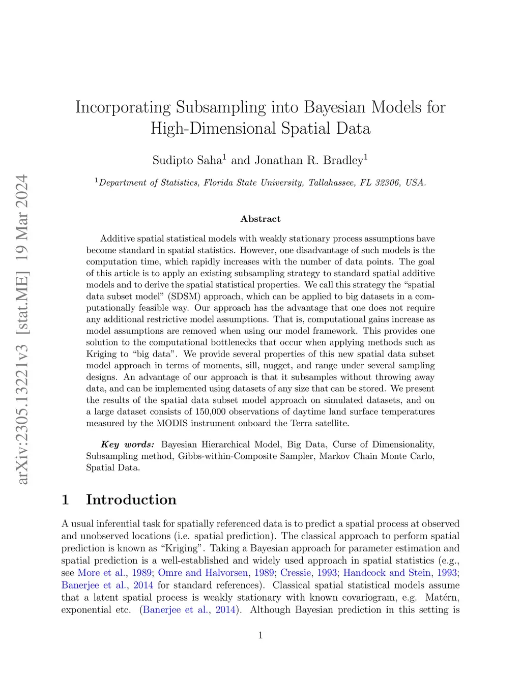 Additive spatial statistical models with weakly stationary process assumptions have become standard in spatial statistics. However, one disadvantage of such models is the computation time, which rapidly increases with the number of data points. The goal of this article is to apply an existing subsampling strategy to standard spatial additive models and to derive the spatial statistical properties. We call this strategy the ''spatial data subset model'' (SDSM) approach, which can be applied to big datasets in a computationally feasible way. Our approach has the advantage that one does not require any additional restrictive model assumptions. That is, computational gains increase as model assumptions are removed when using our model framework. This provides one solution to the computational bottlenecks that occur when applying methods such as Kriging to ''big data''. We provide several properties of this new spatial data subset model approach in terms of moments, sill, nugget, and range under several sampling designs. An advantage of our approach is that it subsamples without throwing away data, and can be implemented using datasets of any size that can be stored. We present the results of the spatial data subset model approach on simulated datasets, and on a large dataset consists of 150,000 observations of daytime land surface temperatures measured by the MODIS instrument onboard the Terra satellite.