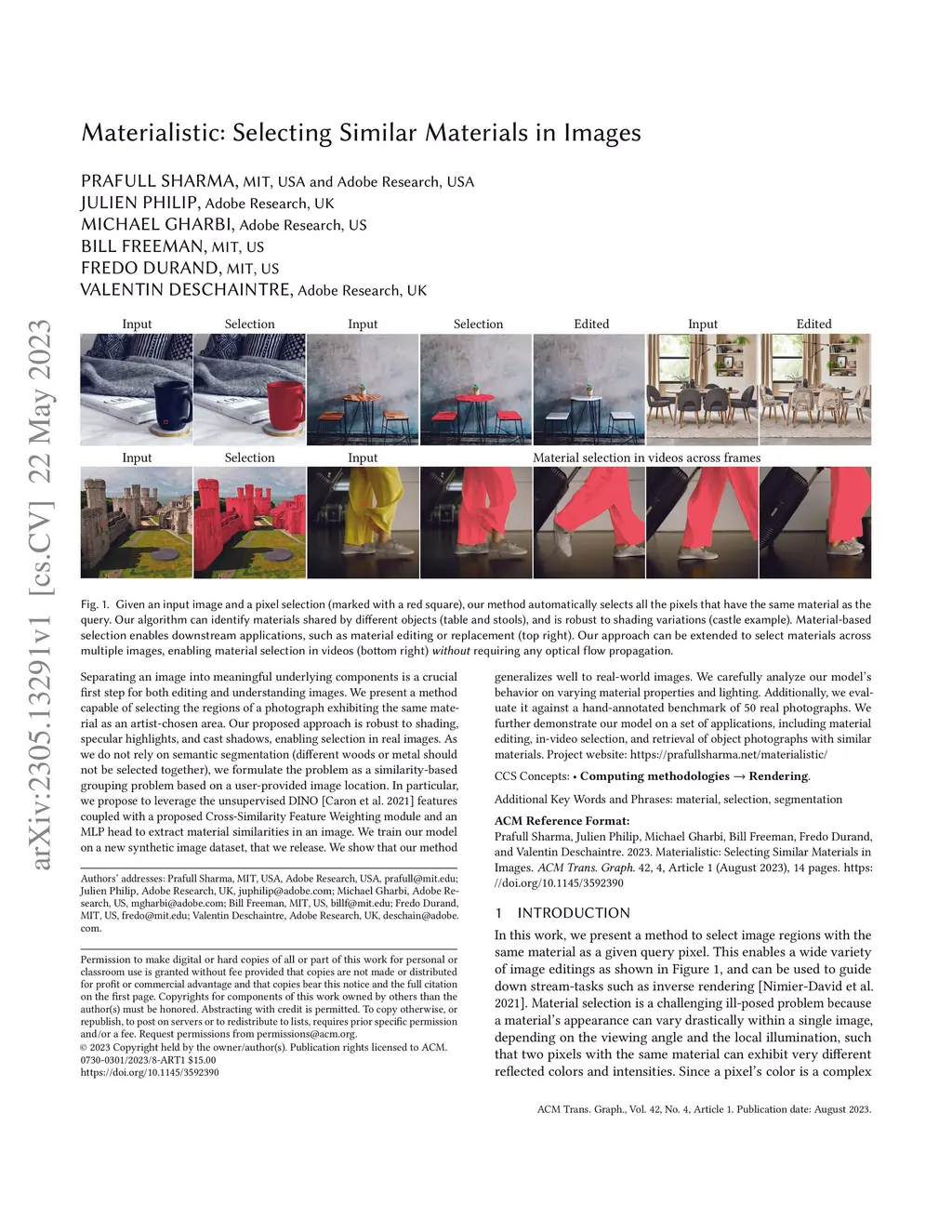 Separating an image into meaningful underlying components is a crucial first step for both editing and understanding images. We present a method capable of selecting the regions of a photograph exhibiting the same material as an artist-chosen area. Our proposed approach is robust to shading, specular highlights, and cast shadows, enabling selection in real images. As we do not rely on semantic segmentation (different woods or metal should not be selected together), we formulate the problem as a similarity-based grouping problem based on a user-provided image location. In particular, we propose to leverage the unsupervised DINO features coupled with a proposed Cross-Similarity module and an MLP head to extract material similarities in an image. We train our model on a new synthetic image dataset, that we release. We show that our method generalizes well to real-world images. We carefully analyze our model's behavior on varying material properties and lighting. Additionally, we evaluate it against a hand-annotated benchmark of 50 real photographs. We further demonstrate our model on a set of applications, including material editing, in-video selection, and retrieval of object photographs with similar materials.