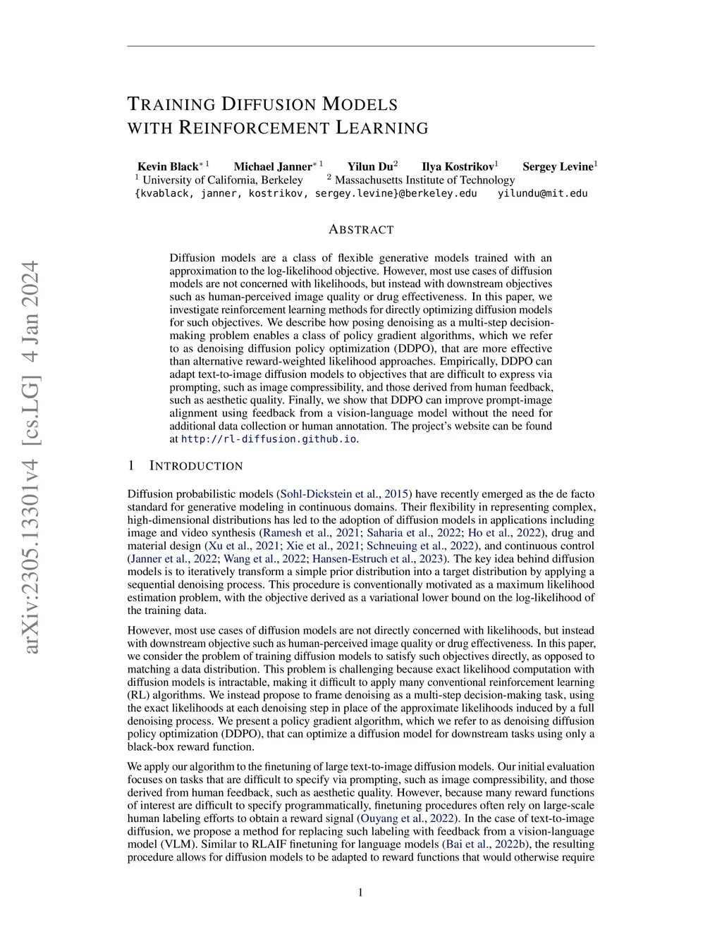Diffusion models are a class of flexible generative models trained with an approximation to the log-likelihood objective. However, most use cases of diffusion models are not concerned with likelihoods, but instead with downstream objectives such as human-perceived image quality or drug effectiveness. In this paper, we investigate reinforcement learning methods for directly optimizing diffusion models for such objectives. We describe how posing denoising as a multi-step decision-making problem enables a class of policy gradient algorithms, which we refer to as denoising diffusion policy optimization (DDPO), that are more effective than alternative reward-weighted likelihood approaches. Empirically, DDPO is able to adapt text-to-image diffusion models to objectives that are difficult to express via prompting, such as image compressibility, and those derived from human feedback, such as aesthetic quality. Finally, we show that DDPO can improve prompt-image alignment using feedback from a vision-language model without the need for additional data collection or human annotation. The project's website can be found at http://rl-diffusion.github.io .