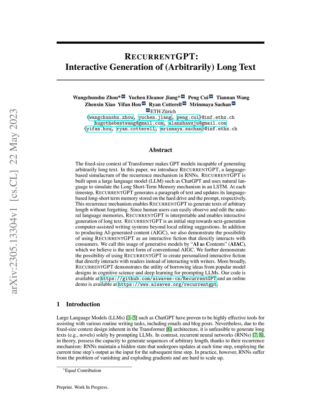 RecurrentGPT: Interactive Generation of (Arbitrarily) Long Text