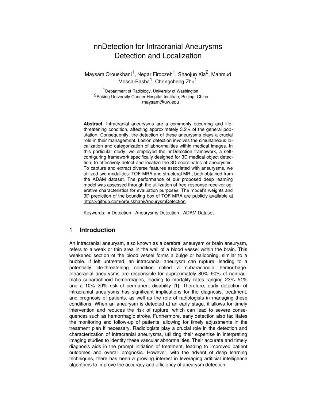 Intracranial aneurysms are a commonly occurring and life-threatening condition, affecting approximately 3.2% of the general population. Consequently, detecting these aneurysms plays a crucial role in their management. Lesion detection involves the simultaneous localization and categorization of abnormalities within medical images. In this study, we employed the nnDetection framework, a self-configuring framework specifically designed for 3D medical object detection, to detect and localize the 3D coordinates of aneurysms effectively. To capture and extract diverse features associated with aneurysms, we utilized TOF-MRA and structural MRI, both obtained from the ADAM dataset. The performance of our proposed deep learning model was assessed through the utilization of free-response receiver operative characteristics for evaluation purposes. The model's weights and 3D prediction of the bounding box of TOF-MRA are publicly available at https://github.com/orouskhani/AneurysmDetection.