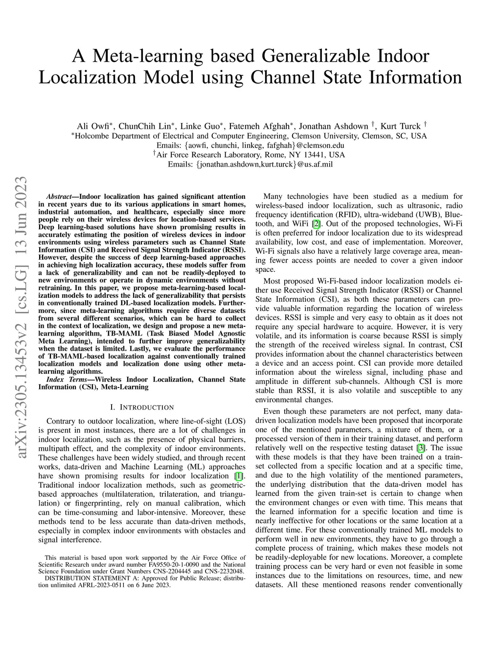 Indoor localization has gained significant attention in recent years due to its various applications in smart homes, industrial automation, and healthcare, especially since more people rely on their wireless devices for location-based services. Deep learning-based solutions have shown promising results in accurately estimating the position of wireless devices in indoor environments using wireless parameters such as Channel State Information (CSI) and Received Signal Strength Indicator (RSSI). However, despite the success of deep learning-based approaches in achieving high localization accuracy, these models suffer from a lack of generalizability and can not be readily-deployed to new environments or operate in dynamic environments without retraining. In this paper, we propose meta-learning-based localization models to address the lack of generalizability that persists in conventionally trained DL-based localization models. Furthermore, since meta-learning algorithms require diverse datasets from several different scenarios, which can be hard to collect in the context of localization, we design and propose a new meta-learning algorithm, TB-MAML (Task Biased Model Agnostic Meta Learning), intended to further improve generalizability when the dataset is limited. Lastly, we evaluate the performance of TB-MAML-based localization against conventionally trained localization models and localization done using other meta-learning algorithms.