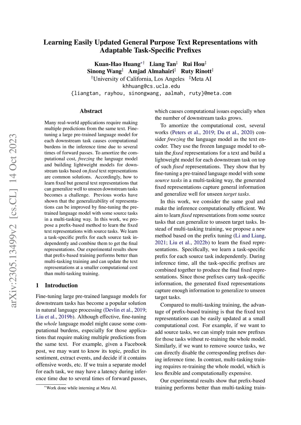 Many real-world applications require making multiple predictions from the same text. Fine-tuning a large pre-trained language model for each downstream task causes computational burdens in the inference time due to several times of forward passes. To amortize the computational cost, freezing the language model and building lightweight models for downstream tasks based on fixed text representations are common solutions. Accordingly, how to learn fixed but general text representations that can generalize well to unseen downstream tasks becomes a challenge. Previous works have shown that the generalizability of representations can be improved by fine-tuning the pre-trained language model with some source tasks in a multi-tasking way. In this work, we propose a prefix-based method to learn the fixed text representations with source tasks. We learn a task-specific prefix for each source task independently and combine them to get the final representations. Our experimental results show that prefix-based training performs better than multi-tasking training and can update the text representations at a smaller computational cost than multi-tasking training.