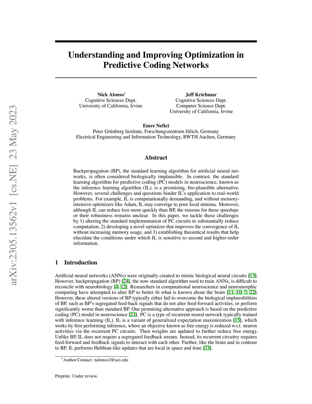 Backpropagation (BP), the standard learning algorithm for artificial neural networks, is often considered biologically implausible. In contrast, the standard learning algorithm for predictive coding (PC) models in neuroscience, known as the inference learning algorithm (IL), is a promising, bio-plausible alternative. However, several challenges and questions hinder IL's application to real-world problems. For example, IL is computationally demanding, and without memory-intensive optimizers like Adam, IL may converge to poor local minima. Moreover, although IL can reduce loss more quickly than BP, the reasons for these speedups or their robustness remains unclear. In this paper, we tackle these challenges by 1) altering the standard implementation of PC circuits to substantially reduce computation, 2) developing a novel optimizer that improves the convergence of IL without increasing memory usage, and 3) establishing theoretical results that help elucidate the conditions under which IL is sensitive to second and higher-order information.