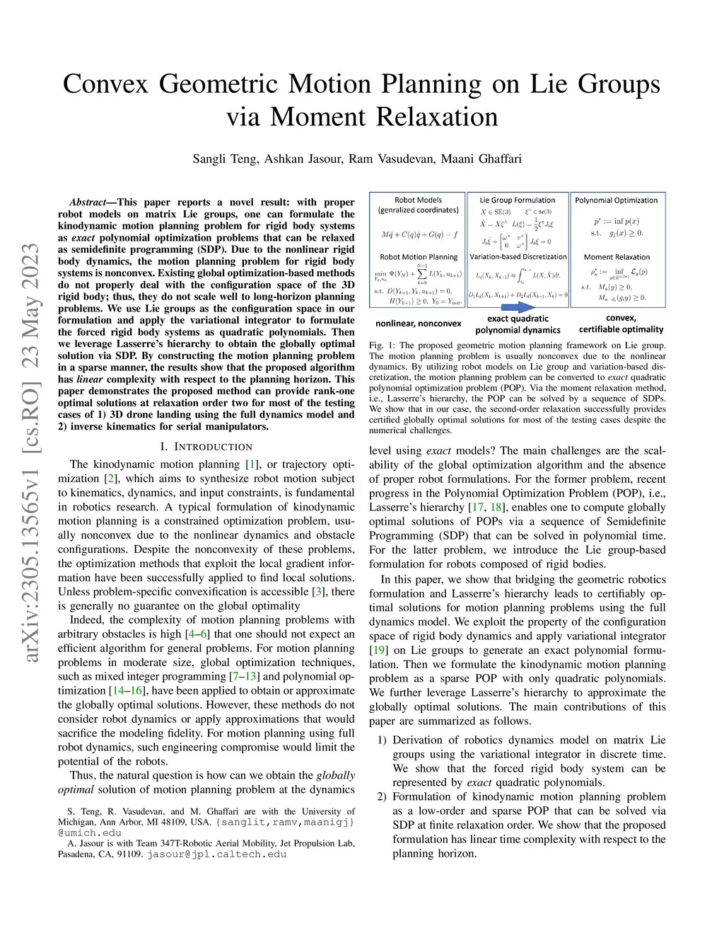 This paper reports a novel result: with proper robot models on matrix Lie groups, one can formulate the kinodynamic motion planning problem for rigid body systems as \emph{exact} polynomial optimization problems that can be relaxed as semidefinite programming (SDP). Due to the nonlinear rigid body dynamics, the motion planning problem for rigid body systems is nonconvex. Existing global optimization-based methods do not properly deal with the configuration space of the 3D rigid body; thus, they do not scale well to long-horizon planning problems. We use Lie groups as the configuration space in our formulation and apply the variational integrator to formulate the forced rigid body systems as quadratic polynomials. Then we leverage Lasserre's hierarchy to obtain the globally optimal solution via SDP. By constructing the motion planning problem in a sparse manner, the results show that the proposed algorithm has \emph{linear} complexity with respect to the planning horizon. This paper demonstrates the proposed method can provide rank-one optimal solutions at relaxation order two for most of the testing cases of 1) 3D drone landing using the full dynamics model and 2) inverse kinematics for serial manipulators.