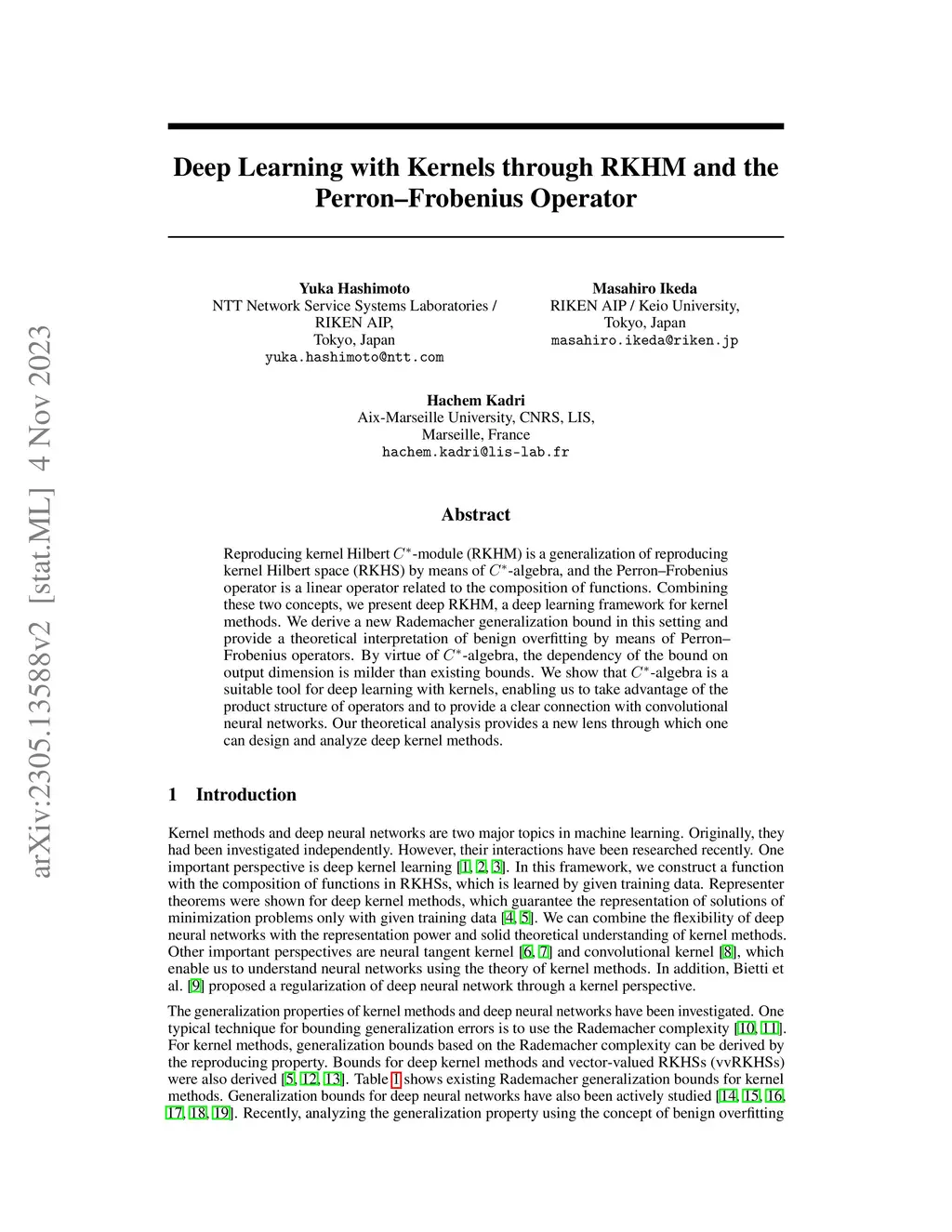 Deep Learning with Kernels through RKHM and the Perron-Frobenius