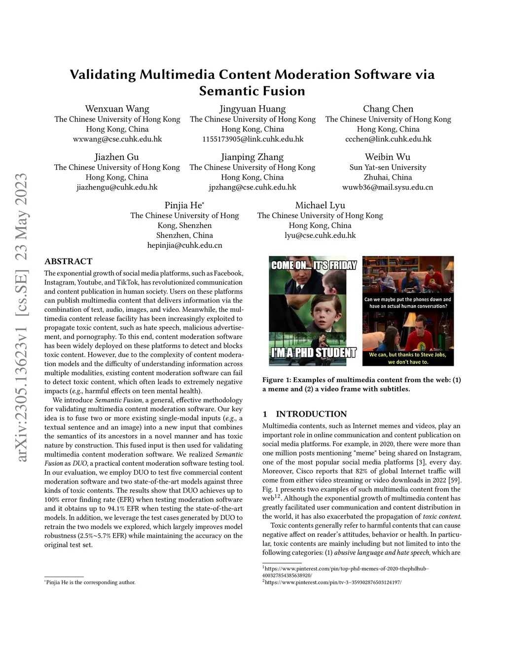 The exponential growth of social media platforms, such as Facebook and TikTok, has revolutionized communication and content publication in human society. Users on these platforms can publish multimedia content that delivers information via the combination of text, audio, images, and video. Meanwhile, the multimedia content release facility has been increasingly exploited to propagate toxic content, such as hate speech, malicious advertisements, and pornography. To this end, content moderation software has been widely deployed on these platforms to detect and blocks toxic content. However, due to the complexity of content moderation models and the difficulty of understanding information across multiple modalities, existing content moderation software can fail to detect toxic content, which often leads to extremely negative impacts. We introduce Semantic Fusion, a general, effective methodology for validating multimedia content moderation software. Our key idea is to fuse two or more existing single-modal inputs (e.g., a textual sentence and an image) into a new input that combines the semantics of its ancestors in a novel manner and has toxic nature by construction. This fused input is then used for validating multimedia content moderation software. We realized Semantic Fusion as DUO, a practical content moderation software testing tool. In our evaluation, we employ DUO to test five commercial content moderation software and two state-of-the-art models against three kinds of toxic content. The results show that DUO achieves up to 100% error finding rate (EFR) when testing moderation software. In addition, we leverage the test cases generated by DUO to retrain the two models we explored, which largely improves model robustness while maintaining the accuracy on the original test set.
