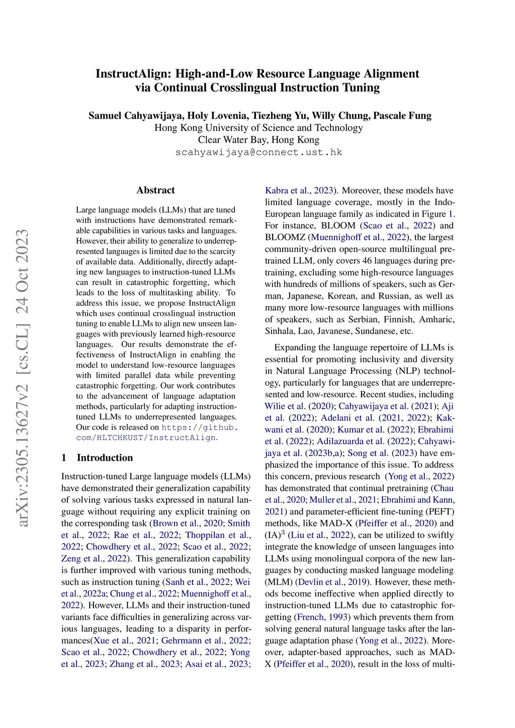 Large language models (LLMs) that are tuned with instructions have demonstrated remarkable capabilities in various tasks and languages. However, their ability to generalize to underrepresented languages is limited due to the scarcity of available data. Additionally, directly adapting new languages to instruction-tuned LLMs can result in catastrophic forgetting, which leads to the loss of multitasking ability. To address this issue, we propose InstructAlign which uses continual crosslingual instruction tuning to enable LLMs to align new unseen languages with previously learned high-resource languages. Our results demonstrate the effectiveness of InstructAlign in enabling the model to understand low-resource languages with limited parallel data while preventing catastrophic forgetting. Our work contributes to the advancement of language adaptation methods, particularly for adapting instruction-tuned LLMs to underrepresented languages. Our code is released on https://github.com/HLTCHKUST/InstructAlign