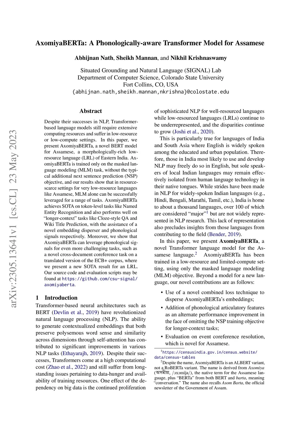 Despite their successes in NLP, Transformer-based language models still require extensive computing resources and suffer in low-resource or low-compute settings. In this paper, we present AxomiyaBERTa, a novel BERT model for Assamese, a morphologically-rich low-resource language (LRL) of Eastern India. AxomiyaBERTa is trained only on the masked language modeling (MLM) task, without the typical additional next sentence prediction (NSP) objective, and our results show that in resource-scarce settings for very low-resource languages like Assamese, MLM alone can be successfully leveraged for a range of tasks. AxomiyaBERTa achieves SOTA on token-level tasks like Named Entity Recognition and also performs well on "longer-context" tasks like Cloze-style QA and Wiki Title Prediction, with the assistance of a novel embedding disperser and phonological signals respectively. Moreover, we show that AxomiyaBERTa can leverage phonological signals for even more challenging tasks, such as a novel cross-document coreference task on a translated version of the ECB+ corpus, where we present a new SOTA result for an LRL. Our source code and evaluation scripts may be found at https://github.com/csu-signal/axomiyaberta.