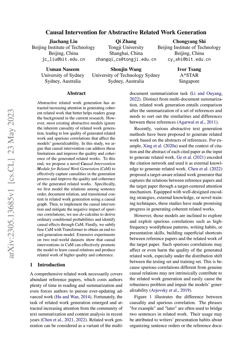 Abstractive related work generation has attracted increasing attention in generating coherent related work that better helps readers grasp the background in the current research. However, most existing abstractive models ignore the inherent causality of related work generation, leading to low quality of generated related work and spurious correlations that affect the models' generalizability. In this study, we argue that causal intervention can address these limitations and improve the quality and coherence of the generated related works. To this end, we propose a novel Causal Intervention Module for Related Work Generation (CaM) to effectively capture causalities in the generation process and improve the quality and coherence of the generated related works. Specifically, we first model the relations among sentence order, document relation, and transitional content in related work generation using a causal graph. Then, to implement the causal intervention and mitigate the negative impact of spurious correlations, we use do-calculus to derive ordinary conditional probabilities and identify causal effects through CaM. Finally, we subtly fuse CaM with Transformer to obtain an end-to-end generation model. Extensive experiments on two real-world datasets show that causal interventions in CaM can effectively promote the model to learn causal relations and produce related work of higher quality and coherence.