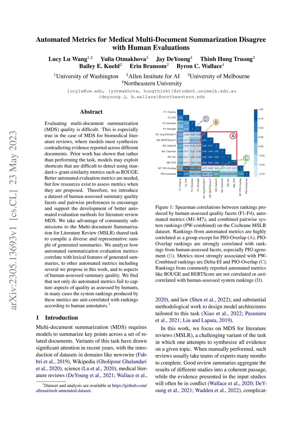 Evaluating multi-document summarization (MDS) quality is difficult. This is especially true in the case of MDS for biomedical literature reviews, where models must synthesize contradicting evidence reported across different documents. Prior work has shown that rather than performing the task, models may exploit shortcuts that are difficult to detect using standard n-gram similarity metrics such as ROUGE. Better automated evaluation metrics are needed, but few resources exist to assess metrics when they are proposed. Therefore, we introduce a dataset of human-assessed summary quality facets and pairwise preferences to encourage and support the development of better automated evaluation methods for literature review MDS. We take advantage of community submissions to the Multi-document Summarization for Literature Review (MSLR) shared task to compile a diverse and representative sample of generated summaries. We analyze how automated summarization evaluation metrics correlate with lexical features of generated summaries, to other automated metrics including several we propose in this work, and to aspects of human-assessed summary quality. We find that not only do automated metrics fail to capture aspects of quality as assessed by humans, in many cases the system rankings produced by these metrics are anti-correlated with rankings according to human annotators.
