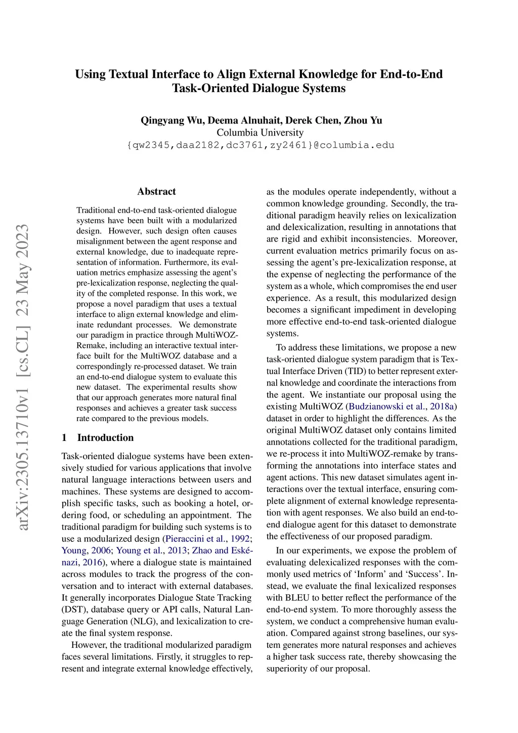 Traditional end-to-end task-oriented dialogue systems have been built with a modularized design. However, such design often causes misalignment between the agent response and external knowledge, due to inadequate representation of information. Furthermore, its evaluation metrics emphasize assessing the agent's pre-lexicalization response, neglecting the quality of the completed response. In this work, we propose a novel paradigm that uses a textual interface to align external knowledge and eliminate redundant processes. We demonstrate our paradigm in practice through MultiWOZ-Remake, including an interactive textual interface built for the MultiWOZ database and a correspondingly re-processed dataset. We train an end-to-end dialogue system to evaluate this new dataset. The experimental results show that our approach generates more natural final responses and achieves a greater task success rate compared to the previous models.