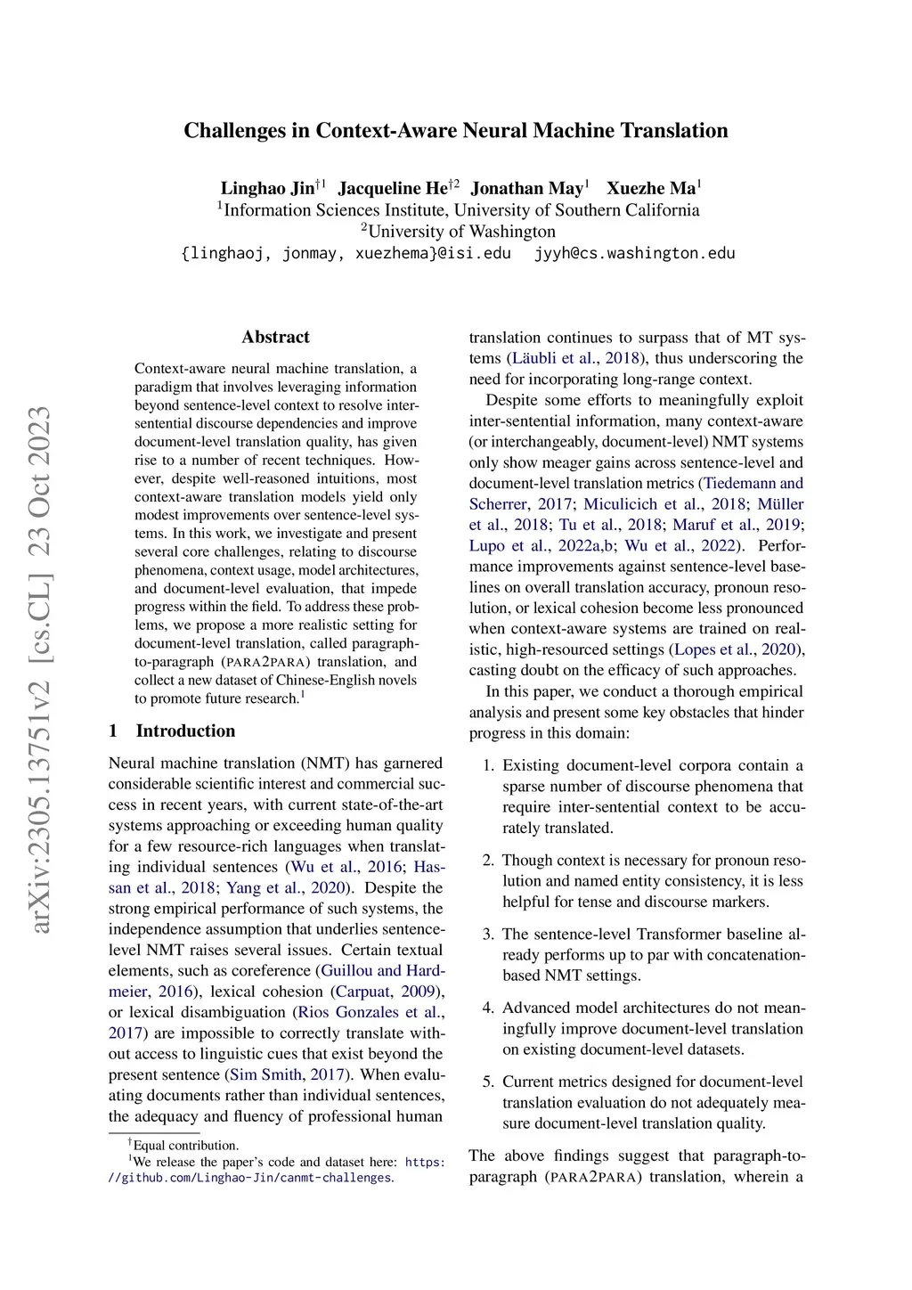 Context-aware neural machine translation involves leveraging information beyond sentence-level context to resolve inter-sentential discourse dependencies and improve document-level translation quality, and has given rise to a number of recent techniques. However, despite well-reasoned intuitions, most context-aware translation models show only modest improvements over sentence-level systems. In this work, we investigate several challenges that impede progress within this field, relating to discourse phenomena, context usage, model architectures, and document-level evaluation. To address these problems, we propose a more realistic setting for document-level translation, called paragraph-to-paragraph (para2para) translation, and collect a new dataset of Chinese-English novels to promote future research.