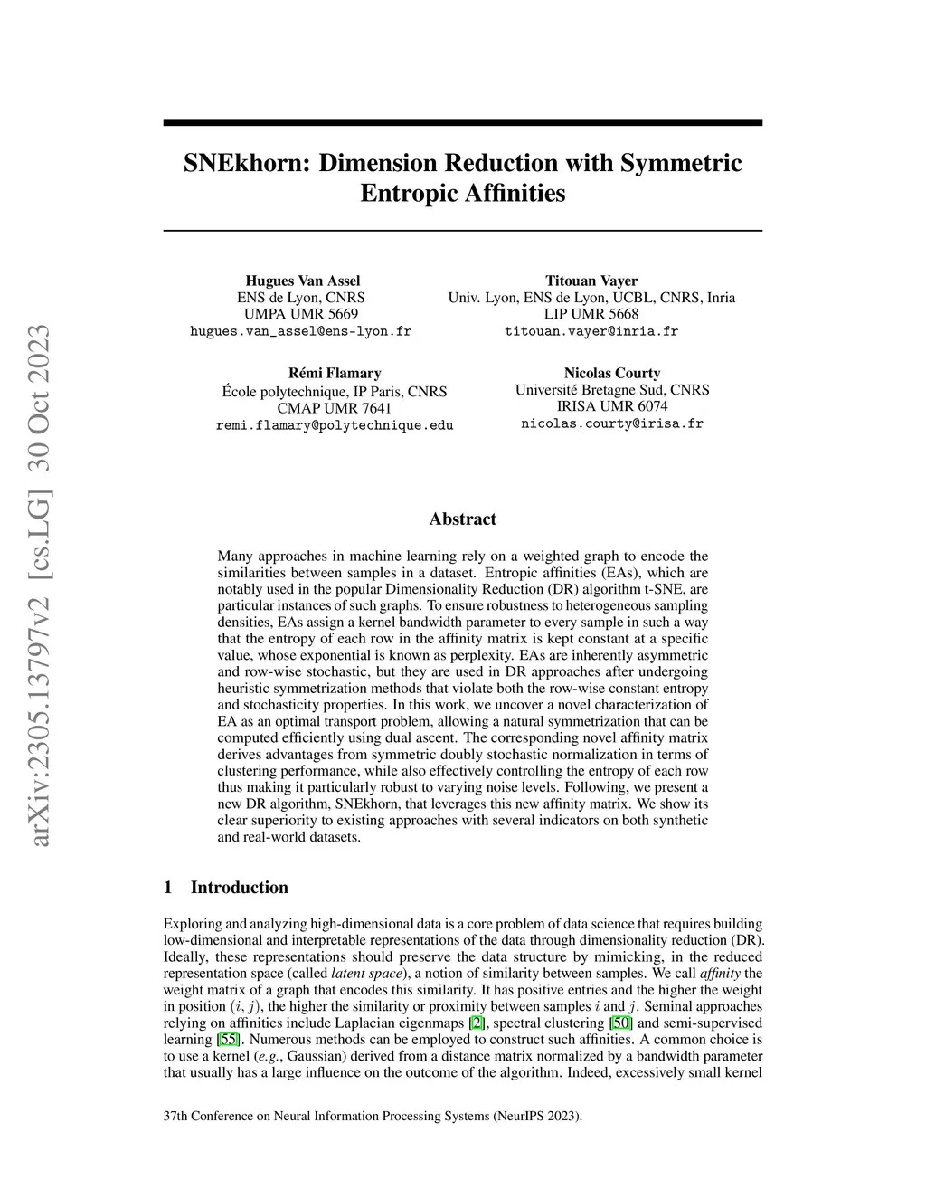 Many approaches in machine learning rely on a weighted graph to encode the similarities between samples in a dataset. Entropic affinities (EAs), which are notably used in the popular Dimensionality Reduction (DR) algorithm t-SNE, are particular instances of such graphs. To ensure robustness to heterogeneous sampling densities, EAs assign a kernel bandwidth parameter to every sample in such a way that the entropy of each row in the affinity matrix is kept constant at a specific value, whose exponential is known as perplexity. EAs are inherently asymmetric and row-wise stochastic, but they are used in DR approaches after undergoing heuristic symmetrization methods that violate both the row-wise constant entropy and stochasticity properties. In this work, we uncover a novel characterization of EA as an optimal transport problem, allowing a natural symmetrization that can be computed efficiently using dual ascent. The corresponding novel affinity matrix derives advantages from symmetric doubly stochastic normalization in terms of clustering performance, while also effectively controlling the entropy of each row thus making it particularly robust to varying noise levels. Following, we present a new DR algorithm, SNEkhorn, that leverages this new affinity matrix. We show its clear superiority to state-of-the-art approaches with several indicators on both synthetic and real-world datasets.