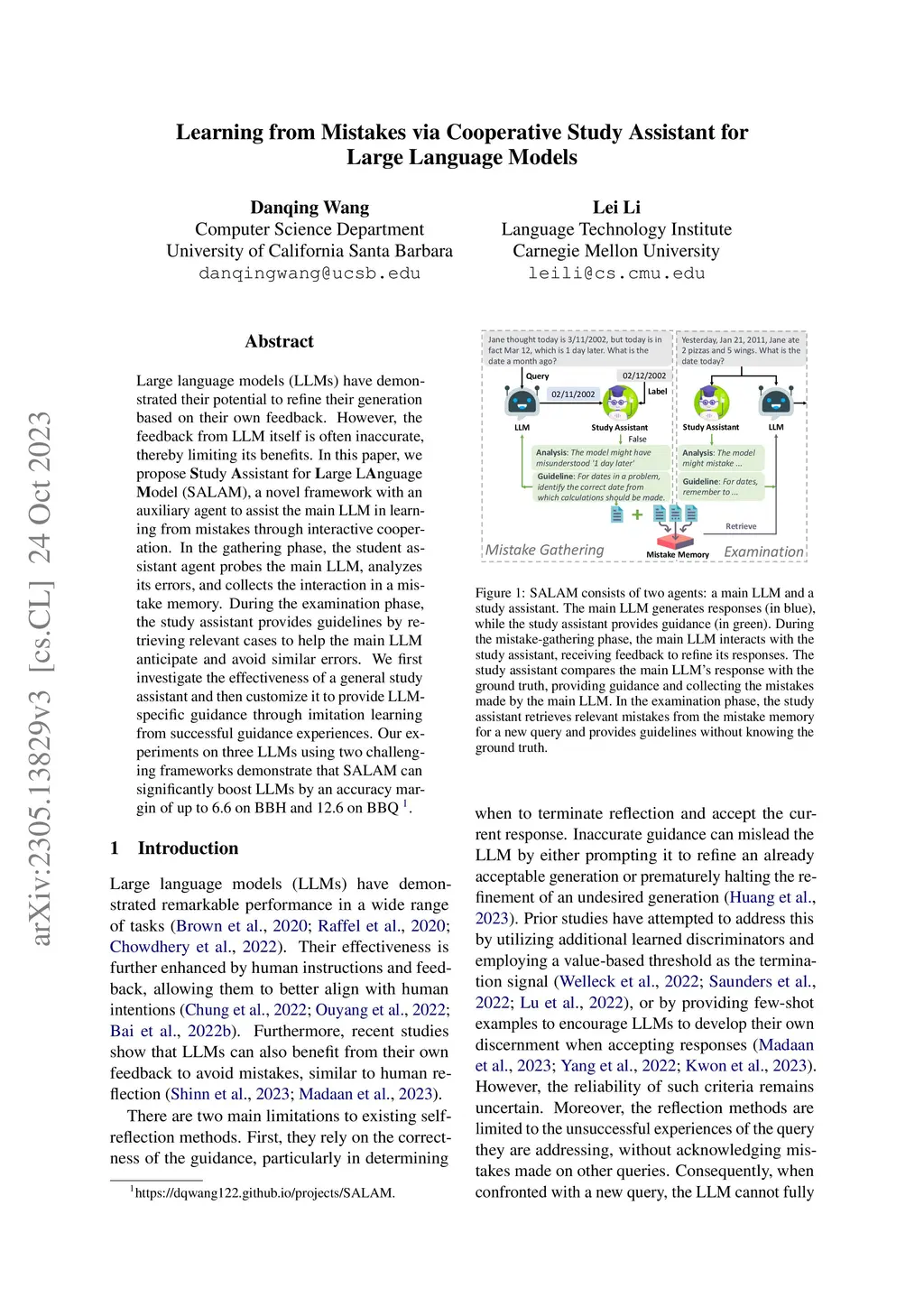 Large language models (LLMs) have demonstrated their potential to refine their generation based on their own feedback. However, the feedback from LLM itself is often inaccurate, thereby limiting its benefits. In this paper, we propose Study Assistant for Large LAnguage Model (SALAM), a novel framework with an auxiliary agent to assist the main LLM in learning from mistakes through interactive cooperation. In the gathering phase, the student assistant agent probes the main LLM, analyzes its errors, and collects the interaction in a mistake memory. During the examination phase, the study assistant provides guidelines by retrieving relevant cases to help the main LLM anticipate and avoid similar errors. We first investigate the effectiveness of a general study assistant and then customize it to provide LLM-specific guidance through imitation learning from successful guidance experiences. Our experiments on three LLMs using two challenging frameworks demonstrate that SALAM can significantly boost LLMs by an accuracy margin of up to 6.6 on BBH and 12.6 on BBQ.