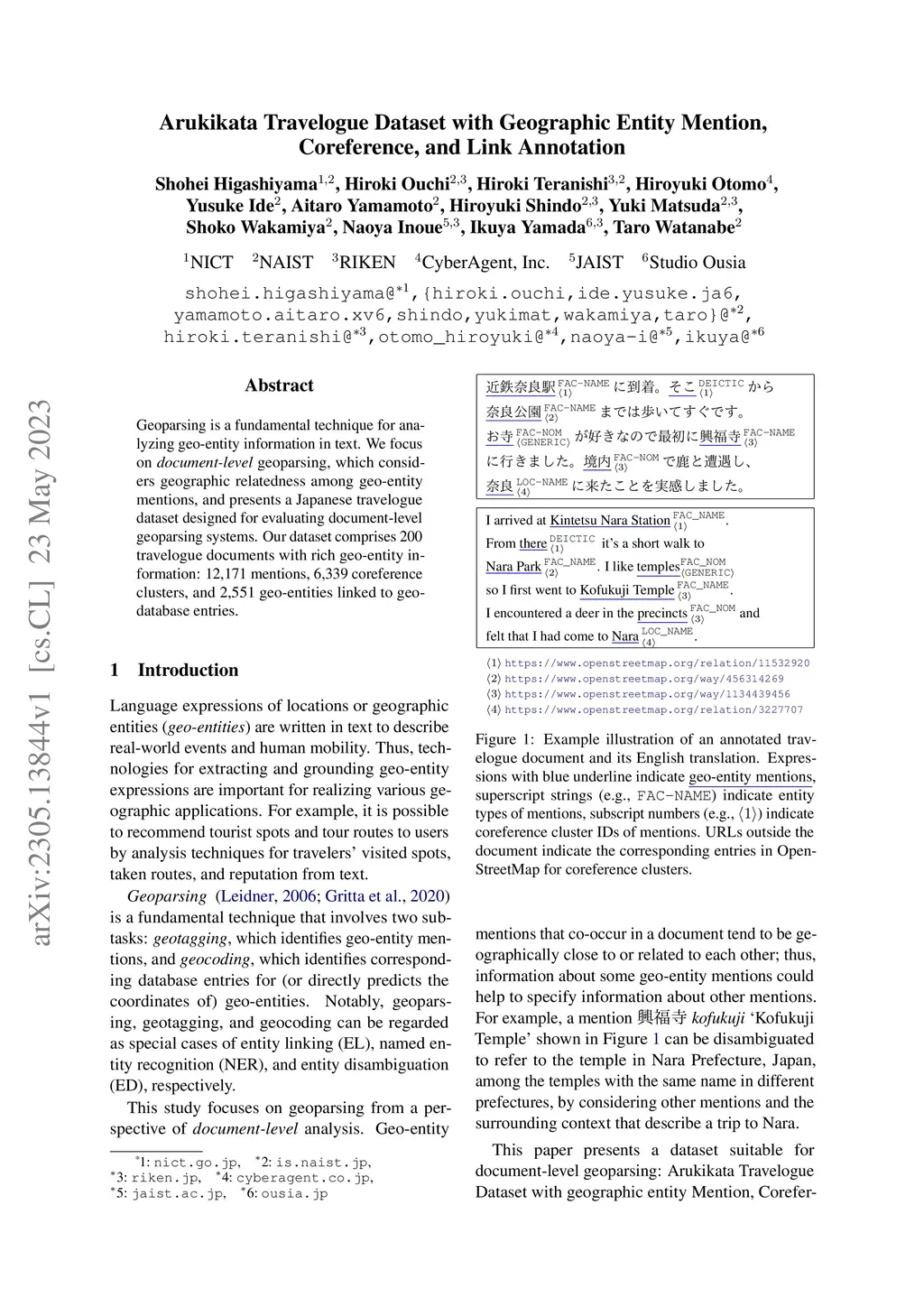 Arukikata Travelogue Dataset with Geographic Entity Mention,