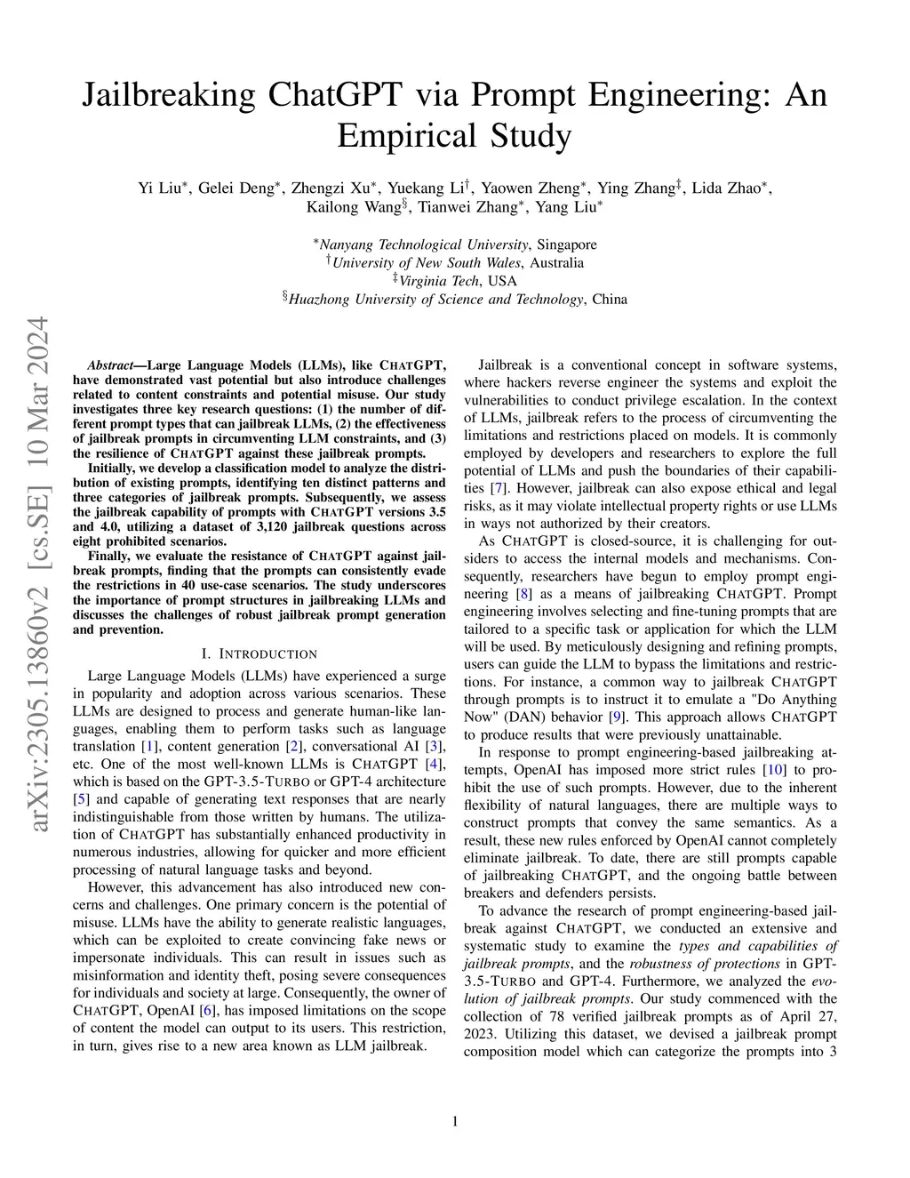 Jailbreaking ChatGPT via Prompt Engineering: An Empirical Study