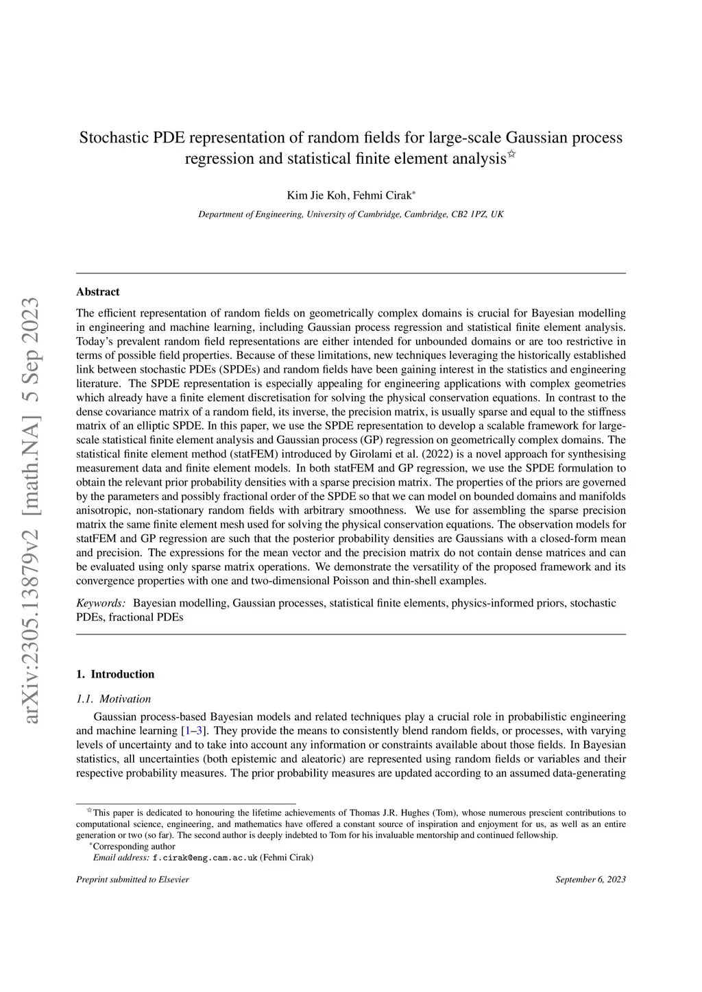 The efficient representation of random fields on geometrically complex domains is crucial for Bayesian modelling in engineering and machine learning. Today's prevalent random field representations are either intended for unbounded domains or are too restrictive in terms of possible field properties. Because of these limitations, techniques leveraging the historically established link between stochastic PDEs (SPDEs) and random fields have been gaining interest. The SPDE representation is especially appealing for engineering applications which already have a finite element discretisation for solving the physical conservation equations. In contrast to the dense covariance matrix of a random field, its inverse, the precision matrix, is usually sparse and equal to the stiffness matrix of an elliptic SPDE. We use the SPDE representation to develop a scalable framework for large-scale statistical finite element analysis and Gaussian process (GP) regression on complex geometries. The statistical finite element method (statFEM) introduced by Girolami et al. (2022) is a novel approach for synthesising measurement data and finite element models. In both statFEM and GP regression, we use the SPDE formulation to obtain the relevant prior probability densities with a sparse precision matrix. The properties of the priors are governed by the parameters and possibly fractional order of the SPDE so that we can model on bounded domains and manifolds anisotropic, non-stationary random fields with arbitrary smoothness. The observation models for statFEM and GP regression are such that the posterior probability densities are Gaussians with a closed-form mean and precision. The respective mean vector and precision matrix and can be evaluated using only sparse matrix operations. We demonstrate the versatility of the proposed framework and its convergence properties with Poisson and thin-shell examples.