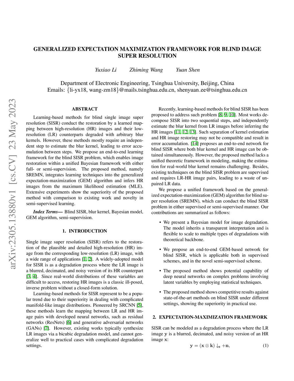 Learning-based methods for blind single image super resolution (SISR) conduct the restoration by a learned mapping between high-resolution (HR) images and their low-resolution (LR) counterparts degraded with arbitrary blur kernels. However, these methods mostly require an independent step to estimate the blur kernel, leading to error accumulation between steps. We propose an end-to-end learning framework for the blind SISR problem, which enables image restoration within a unified Bayesian framework with either full- or semi-supervision. The proposed method, namely SREMN, integrates learning techniques into the generalized expectation-maximization (GEM) algorithm and infers HR images from the maximum likelihood estimation (MLE). Extensive experiments show the superiority of the proposed method with comparison to existing work and novelty in semi-supervised learning.
