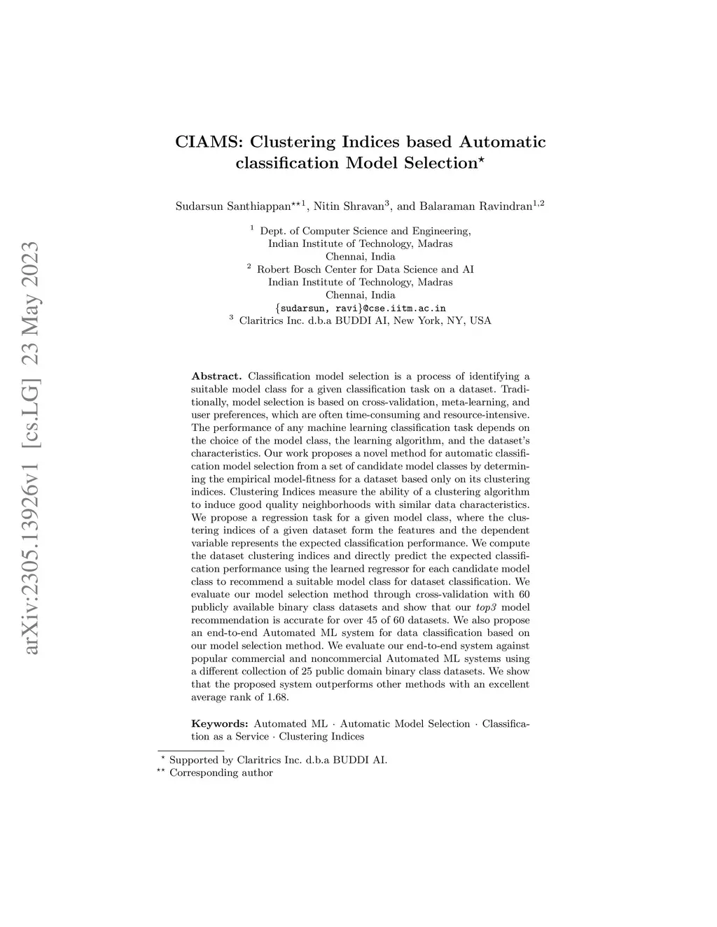 Classification model selection is a process of identifying a suitable model class for a given classification task on a dataset. Traditionally, model selection is based on cross-validation, meta-learning, and user preferences, which are often time-consuming and resource-intensive. The performance of any machine learning classification task depends on the choice of the model class, the learning algorithm, and the dataset's characteristics. Our work proposes a novel method for automatic classification model selection from a set of candidate model classes by determining the empirical model-fitness for a dataset based only on its clustering indices. Clustering Indices measure the ability of a clustering algorithm to induce good quality neighborhoods with similar data characteristics. We propose a regression task for a given model class, where the clustering indices of a given dataset form the features and the dependent variable represents the expected classification performance. We compute the dataset clustering indices and directly predict the expected classification performance using the learned regressor for each candidate model class to recommend a suitable model class for dataset classification. We evaluate our model selection method through cross-validation with 60 publicly available binary class datasets and show that our top3 model recommendation is accurate for over 45 of 60 datasets. We also propose an end-to-end Automated ML system for data classification based on our model selection method. We evaluate our end-to-end system against popular commercial and noncommercial Automated ML systems using a different collection of 25 public domain binary class datasets. We show that the proposed system outperforms other methods with an excellent average rank of 1.68.
