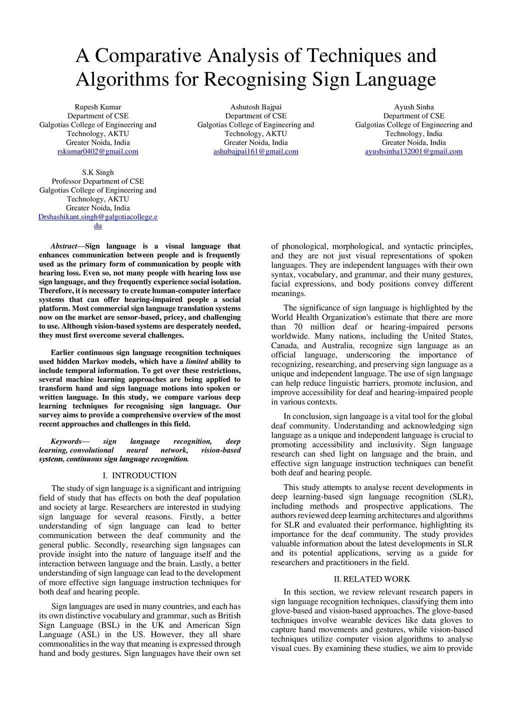 Sign language is a visual language that enhances communication between people and is frequently used as the primary form of communication by people with hearing loss. Even so, not many people with hearing loss use sign language, and they frequently experience social isolation. Therefore, it is necessary to create human-computer interface systems that can offer hearing-impaired people a social platform. Most commercial sign language translation systems now on the market are sensor-based, pricey, and challenging to use. Although vision-based systems are desperately needed, they must first overcome several challenges. Earlier continuous sign language recognition techniques used hidden Markov models, which have a limited ability to include temporal information. To get over these restrictions, several machine learning approaches are being applied to transform hand and sign language motions into spoken or written language. In this study, we compare various deep learning techniques for recognising sign language. Our survey aims to provide a comprehensive overview of the most recent approaches and challenges in this field.