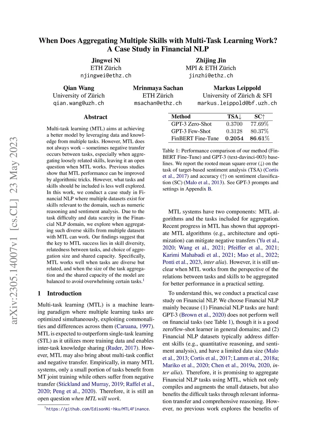Multi-task learning (MTL) aims at achieving a better model by leveraging data and knowledge from multiple tasks. However, MTL does not always work -- sometimes negative transfer occurs between tasks, especially when aggregating loosely related skills, leaving it an open question when MTL works. Previous studies show that MTL performance can be improved by algorithmic tricks. However, what tasks and skills should be included is less well explored. In this work, we conduct a case study in Financial NLP where multiple datasets exist for skills relevant to the domain, such as numeric reasoning and sentiment analysis. Due to the task difficulty and data scarcity in the Financial NLP domain, we explore when aggregating such diverse skills from multiple datasets with MTL can work. Our findings suggest that the key to MTL success lies in skill diversity, relatedness between tasks, and choice of aggregation size and shared capacity. Specifically, MTL works well when tasks are diverse but related, and when the size of the task aggregation and the shared capacity of the model are balanced to avoid overwhelming certain tasks.