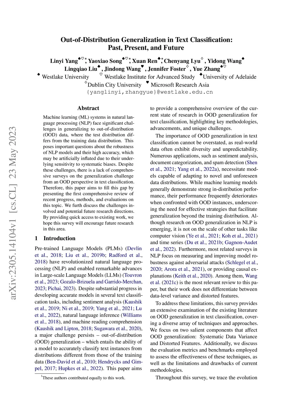 Machine learning (ML) systems in natural language processing (NLP) face significant challenges in generalizing to out-of-distribution (OOD) data, where the test distribution differs from the training data distribution. This poses important questions about the robustness of NLP models and their high accuracy, which may be artificially inflated due to their underlying sensitivity to systematic biases. Despite these challenges, there is a lack of comprehensive surveys on the generalization challenge from an OOD perspective in text classification. Therefore, this paper aims to fill this gap by presenting the first comprehensive review of recent progress, methods, and evaluations on this topic. We furth discuss the challenges involved and potential future research directions. By providing quick access to existing work, we hope this survey will encourage future research in this area.