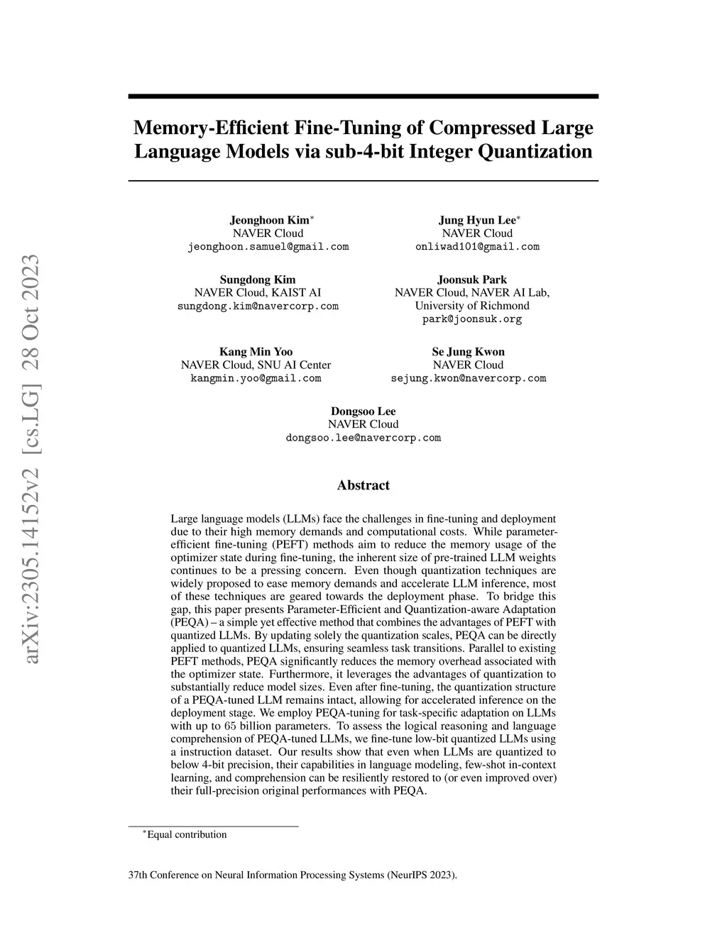 Large language models (LLMs) face the challenges in fine-tuning and deployment due to their high memory demands and computational costs. While parameter-efficient fine-tuning (PEFT) methods aim to reduce the memory usage of the optimizer state during fine-tuning, the inherent size of pre-trained LLM weights continues to be a pressing concern. Even though quantization techniques are widely proposed to ease memory demands and accelerate LLM inference, most of these techniques are geared towards the deployment phase. To bridge this gap, this paper presents Parameter-Efficient and Quantization-aware Adaptation (PEQA) - a simple yet effective method that combines the advantages of PEFT with quantized LLMs. By updating solely the quantization scales, PEQA can be directly applied to quantized LLMs, ensuring seamless task transitions. Parallel to existing PEFT methods, PEQA significantly reduces the memory overhead associated with the optimizer state. Furthermore, it leverages the advantages of quantization to substantially reduce model sizes. Even after fine-tuning, the quantization structure of a PEQA-tuned LLM remains intact, allowing for accelerated inference on the deployment stage. We employ PEQA-tuning for task-specific adaptation on LLMs with up to 65 billion parameters. To assess the logical reasoning and language comprehension of PEQA-tuned LLMs, we fine-tune low-bit quantized LLMs using a instruction dataset. Our results show that even when LLMs are quantized to below 4-bit precision, their capabilities in language modeling, few-shot in-context learning, and comprehension can be resiliently restored to (or even improved over) their full-precision original performances with PEQA.
