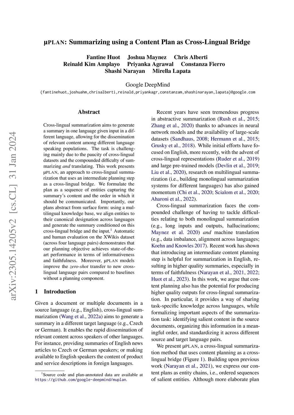 PLAN: Summarizing using a Content Plan as Cross-Lingual Bridge